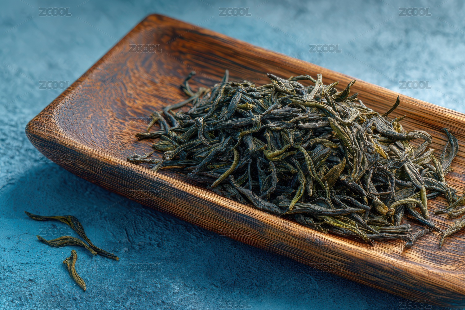 青花瓷盘子里面放着明前信阳毛尖干茶近摄