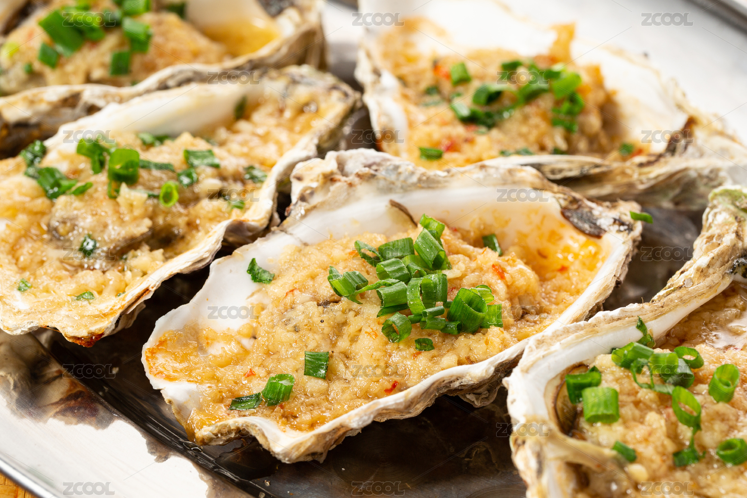 桌面上的盘子里的可口的可口的蒜蓉烤生蚝