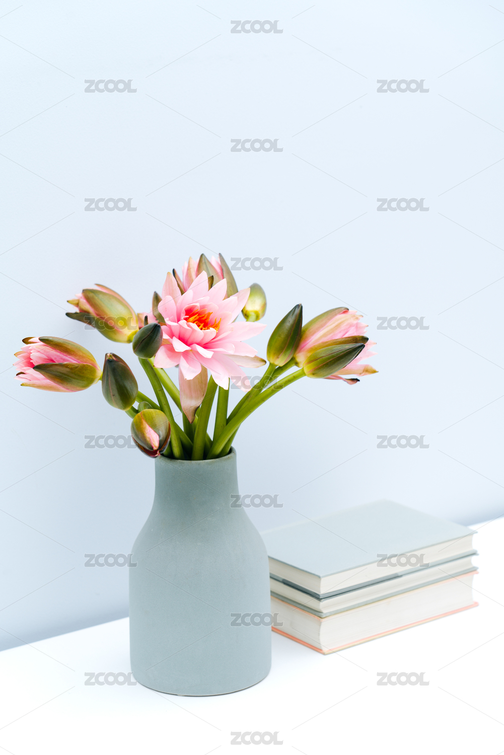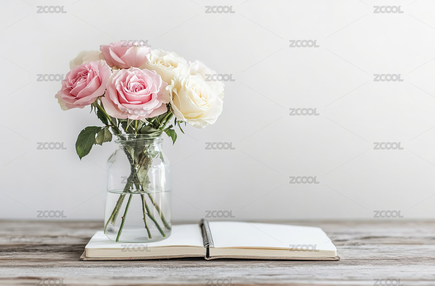 木桌玫瑰插花与翻开书本营造文艺氛围