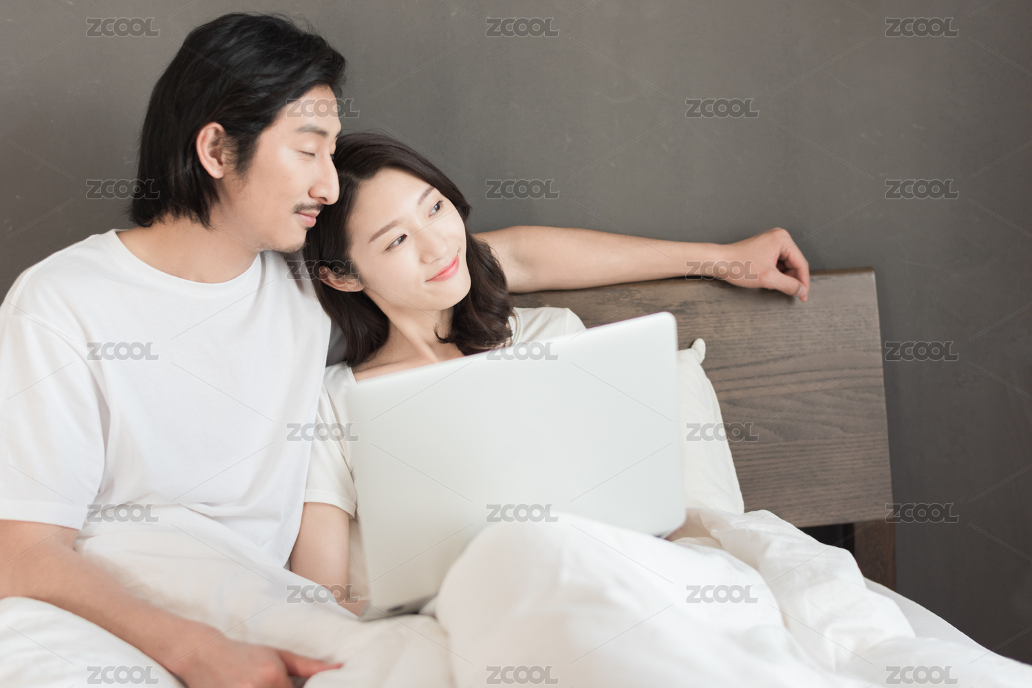 穿着白色短袖坐在床上的一对亚洲年轻情侣,正在快乐的玩着电脑