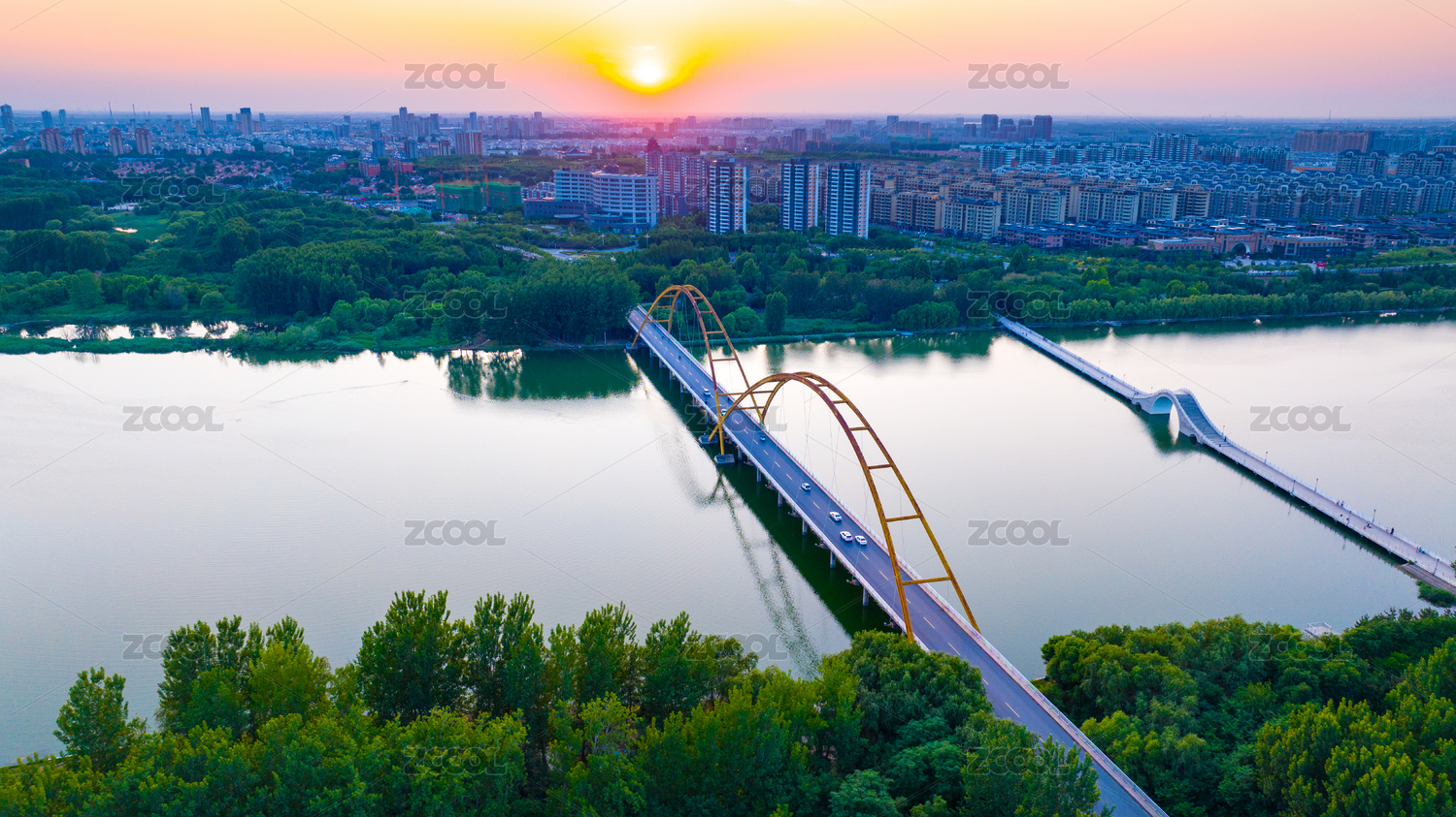 辽宁盘锦辽河盘锦大桥日出航拍
