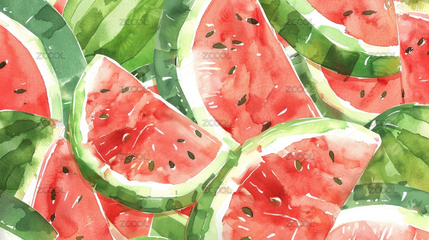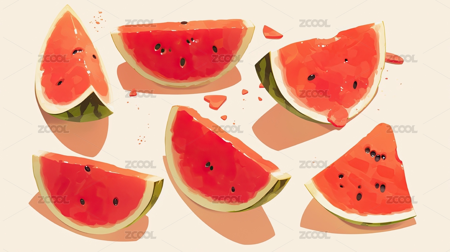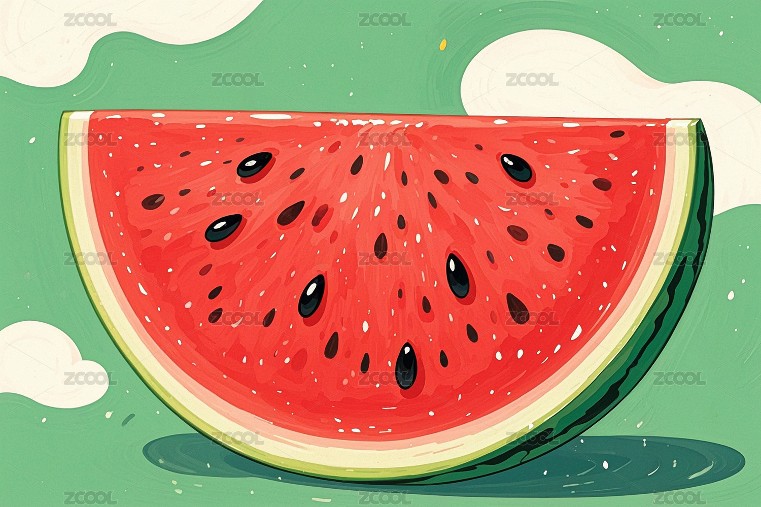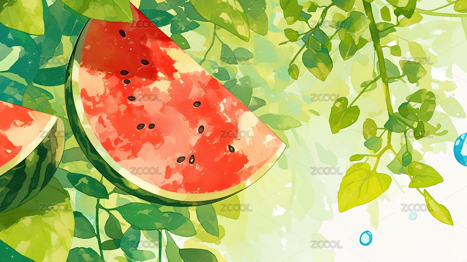 夏天清爽西瓜插画,立夏节气西瓜美食场景插