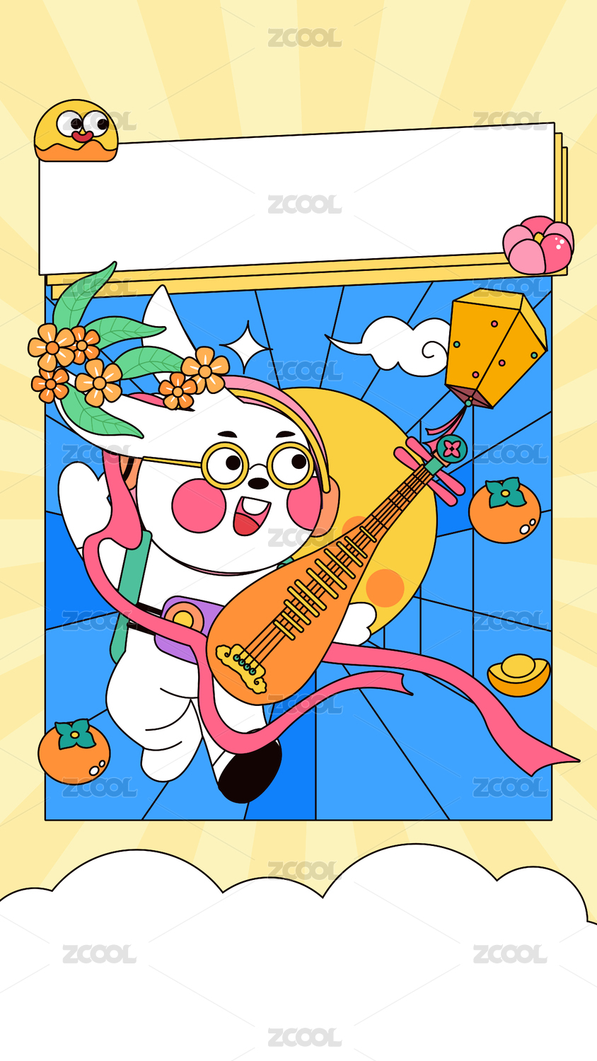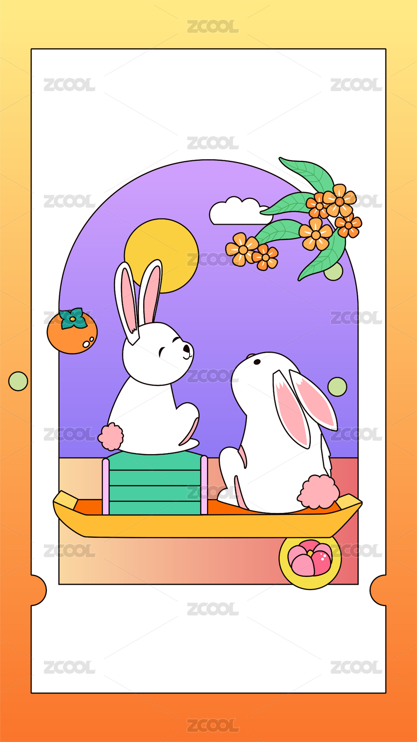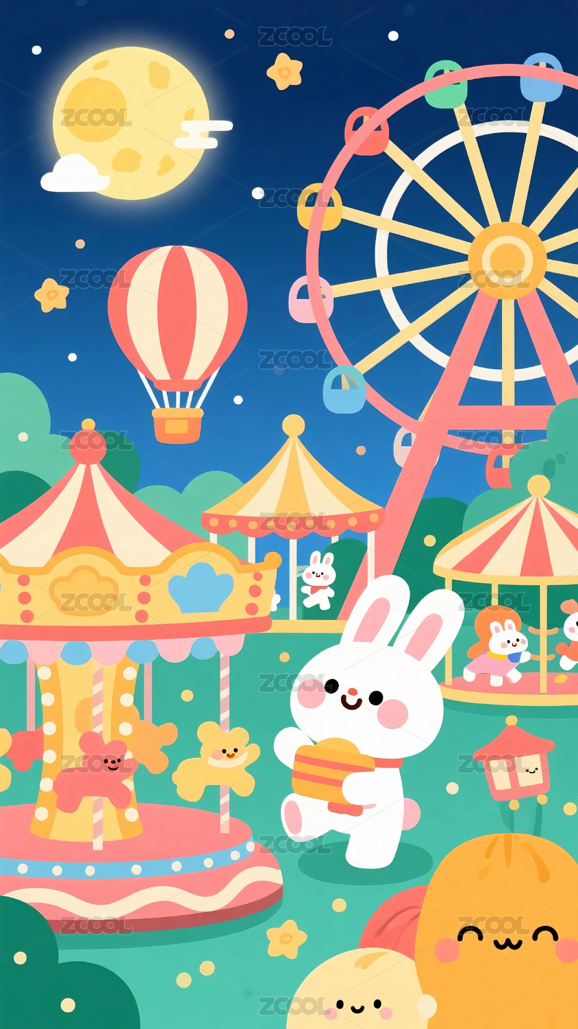 中秋节插画卡通风格的小朋友与玉兔在游乐园