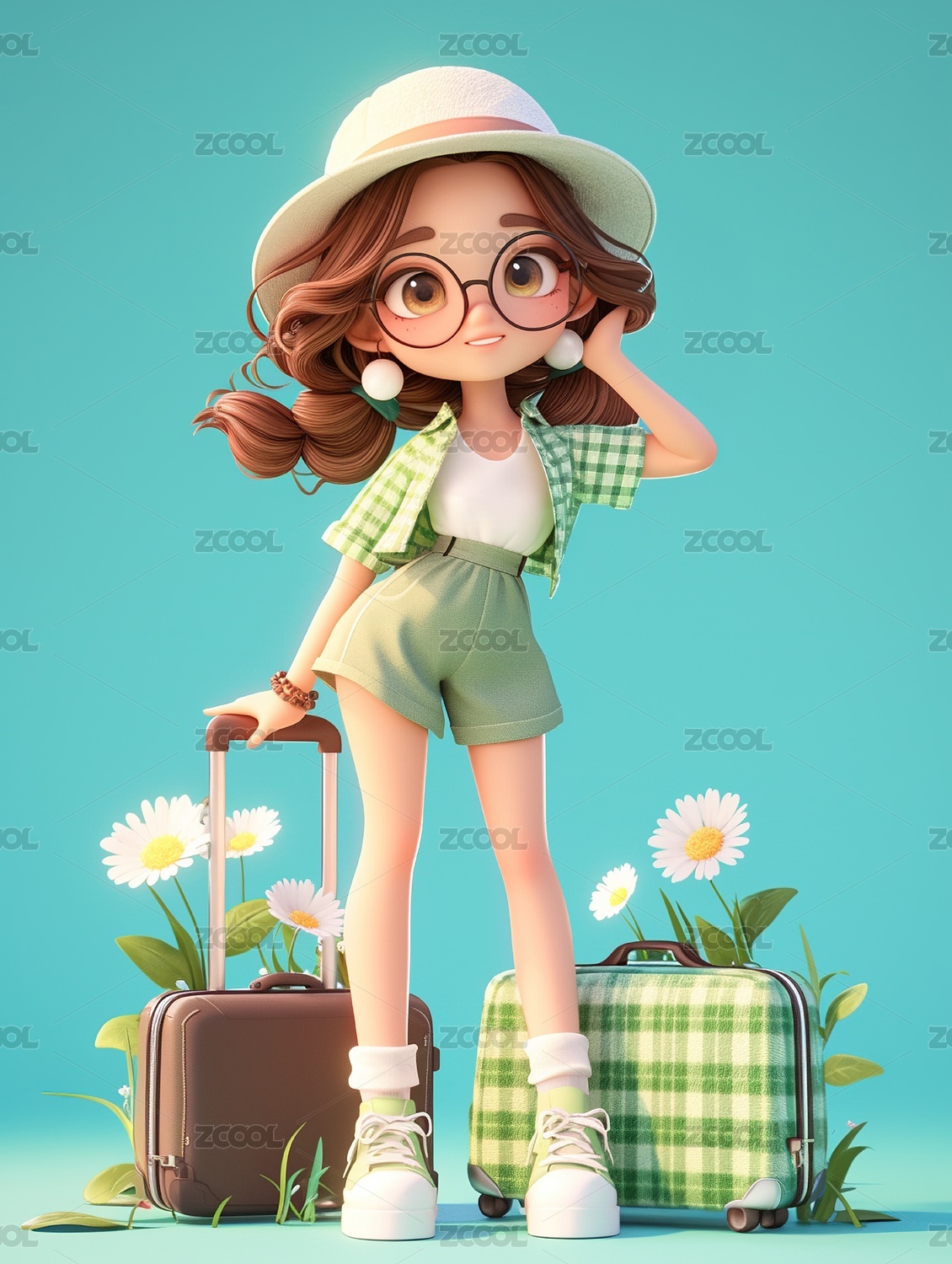 3D卡通女孩行李箱旅行元素