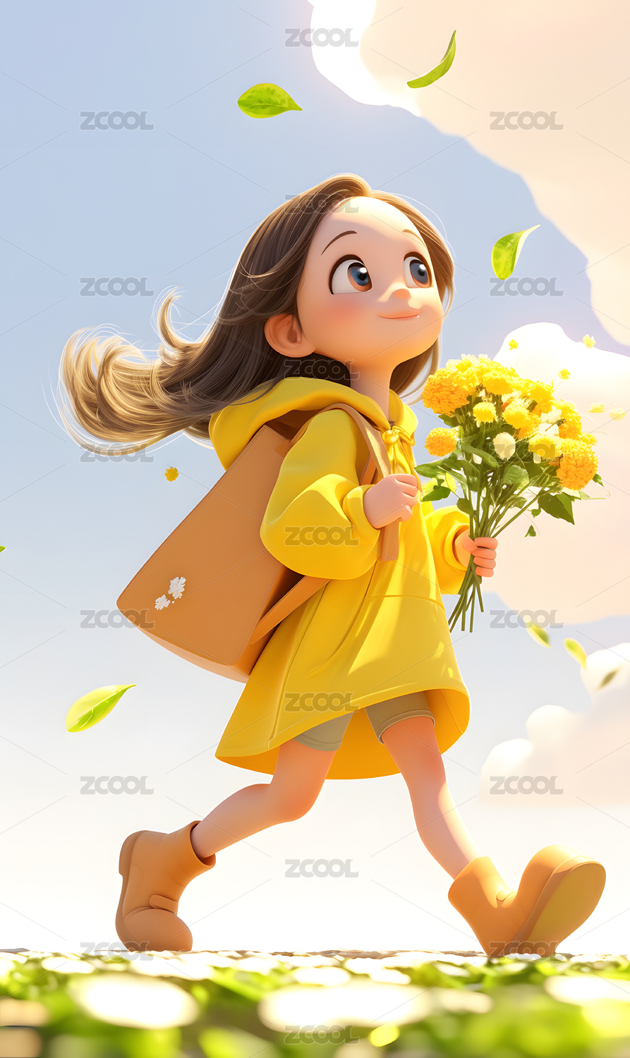 3D卡通女孩手拿鲜花走路