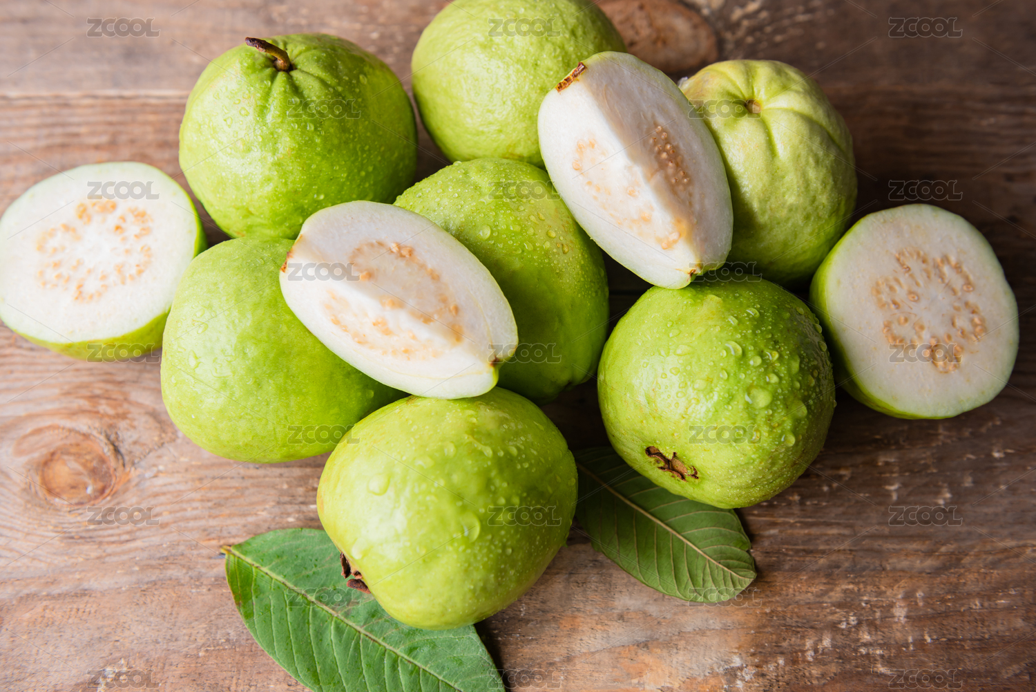 棕色木纹桌上放着一些芭乐水果