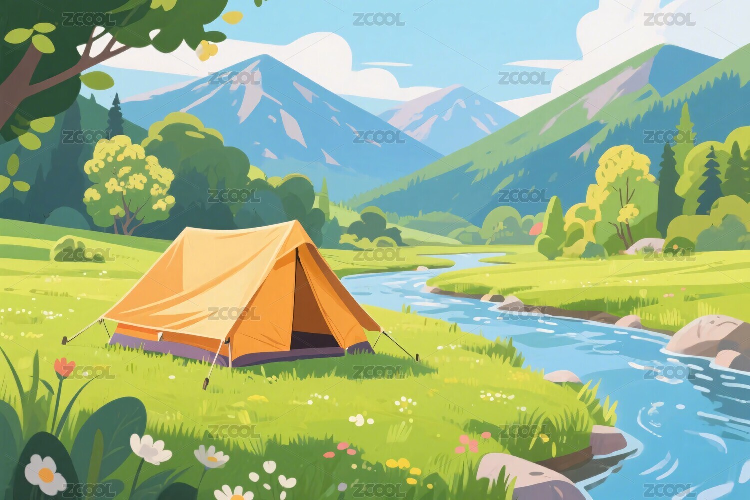 田园露营帐篷卡通插画