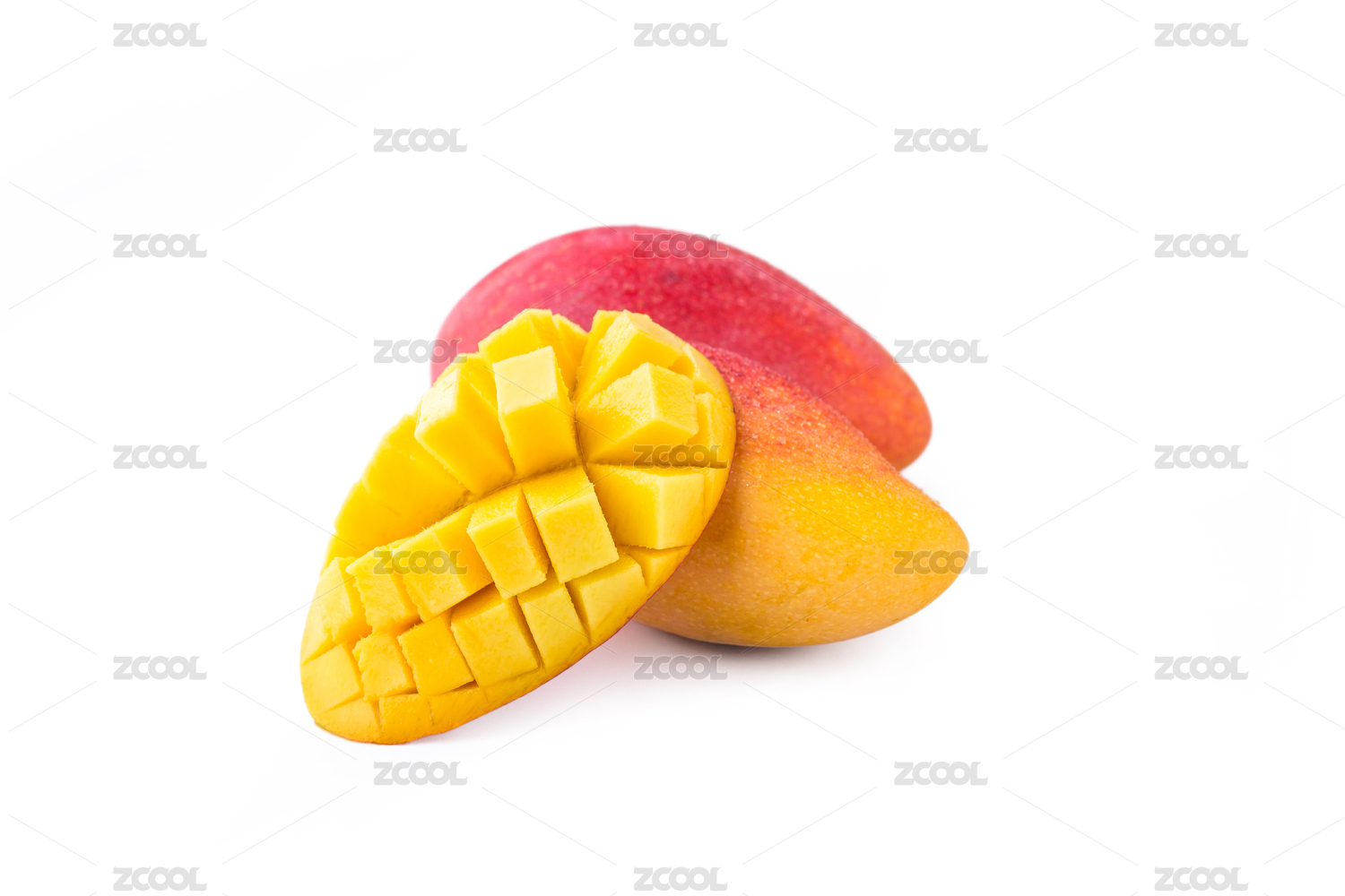 白底上放着一堆新鲜玉芒果和切开的芒果