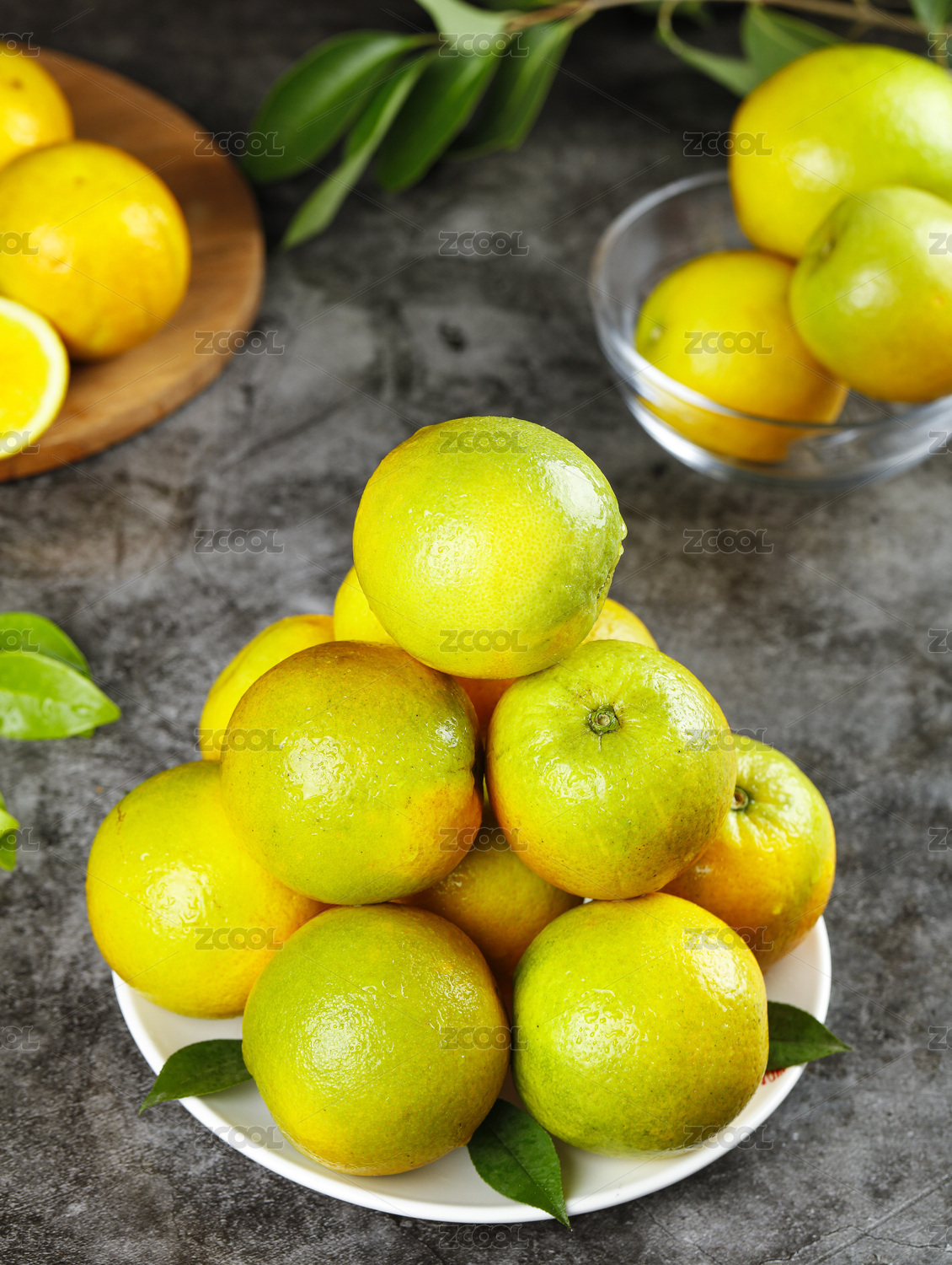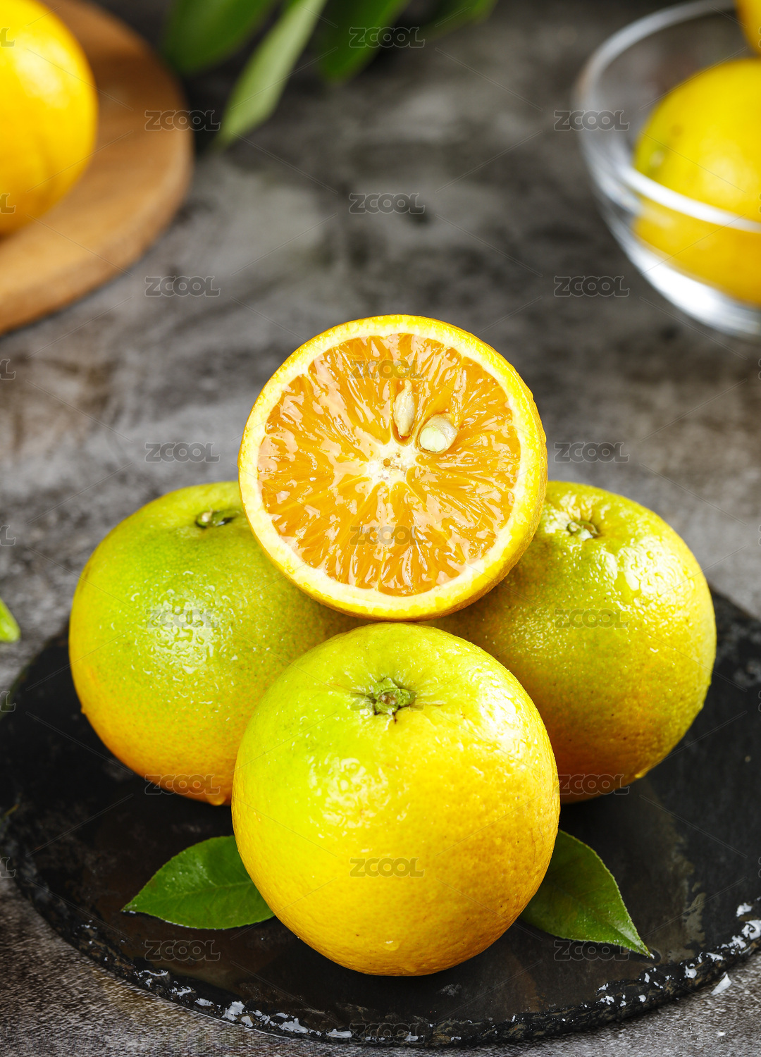 黑石板上放着一堆湖南麻阳冰糖橙和切块橙子