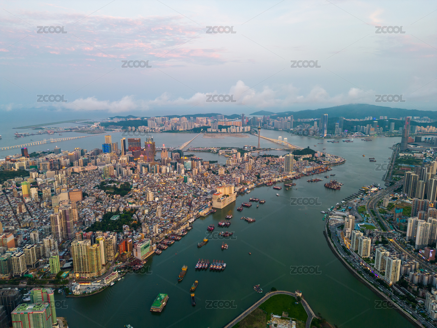 中国澳门半岛与珠海城市风光航拍