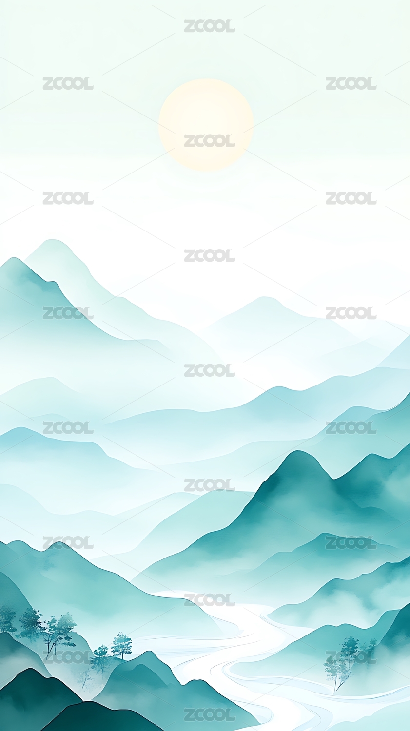 蓝青色水墨风远山山脉插画