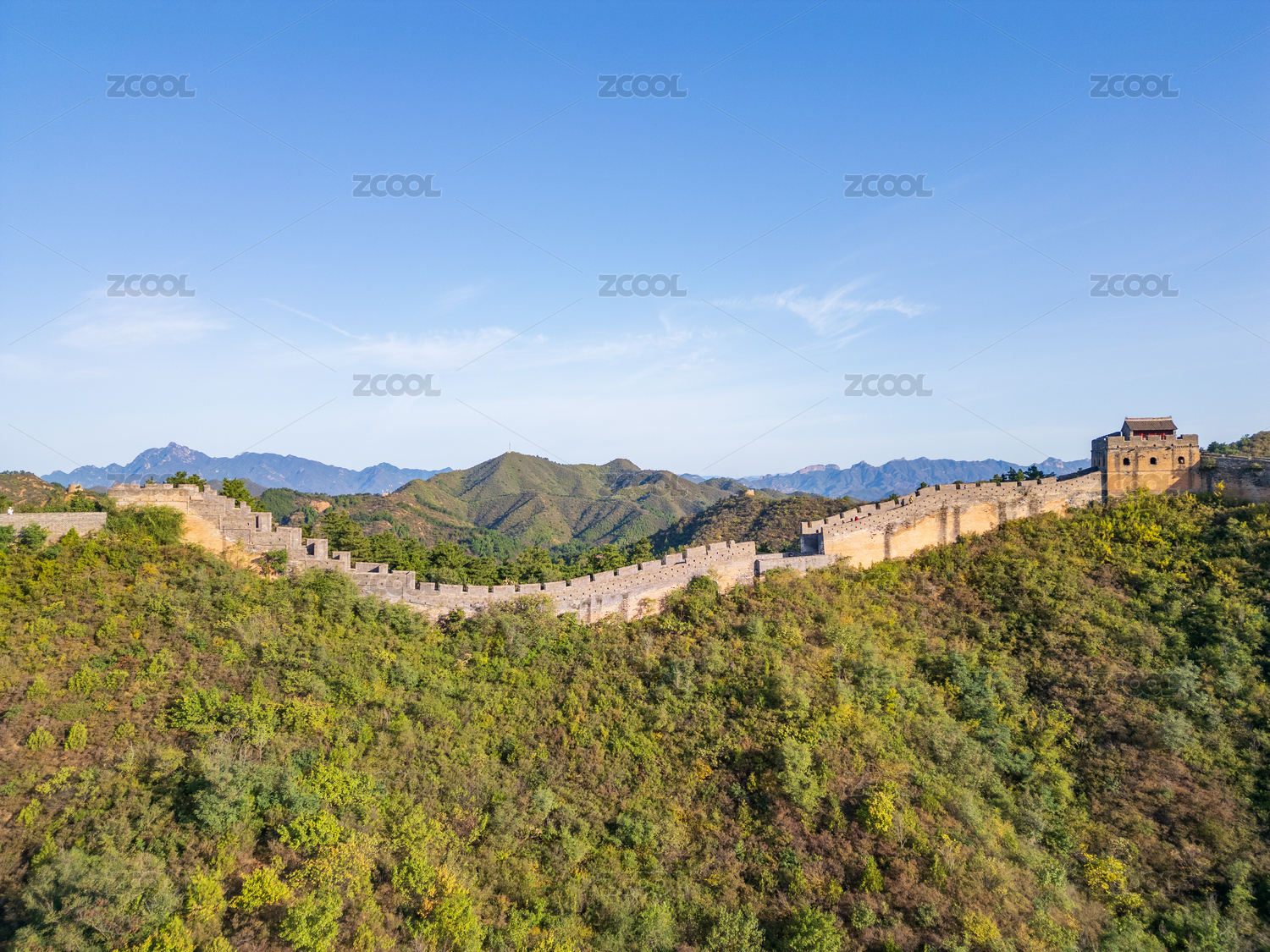 蓝天白云下的中国长城蜿蜒盘旋丛山峻岭