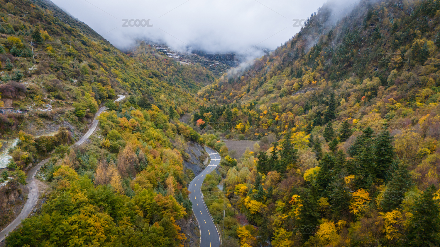 航拍云雾缭绕的中国四川甘孜秋季自然风光