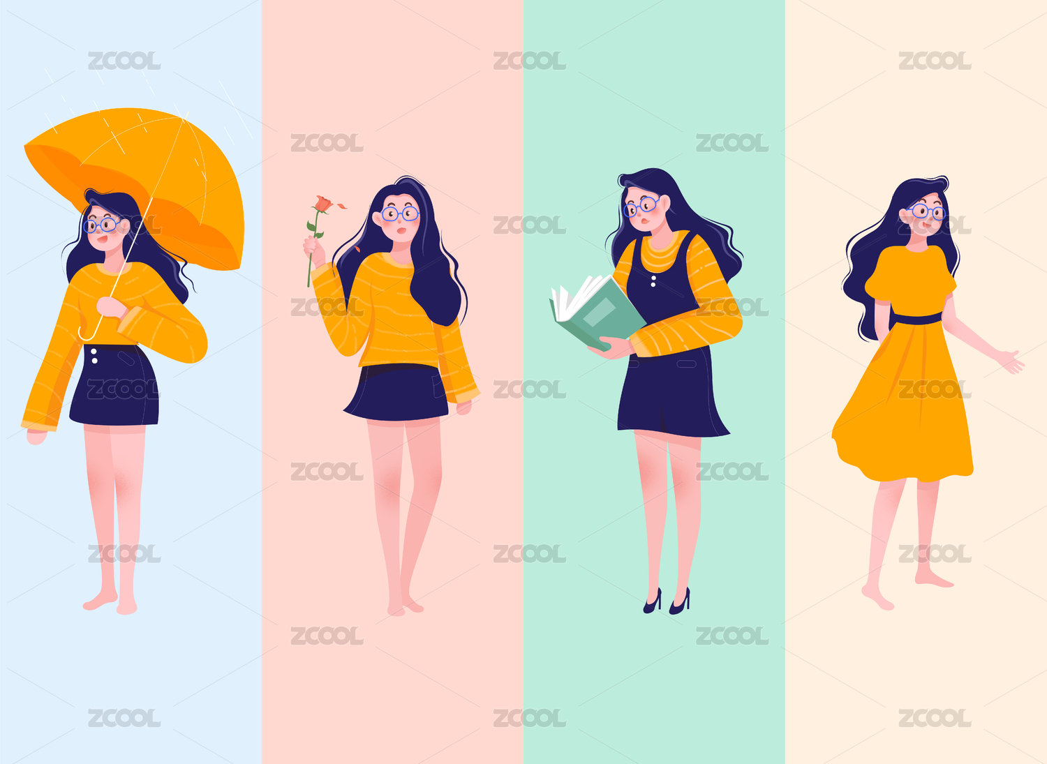 扁平化,矢量,大波浪,美女,女孩,女生,人设,插画,日常,生活
