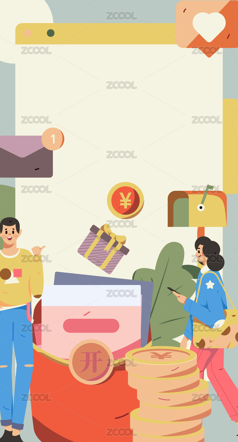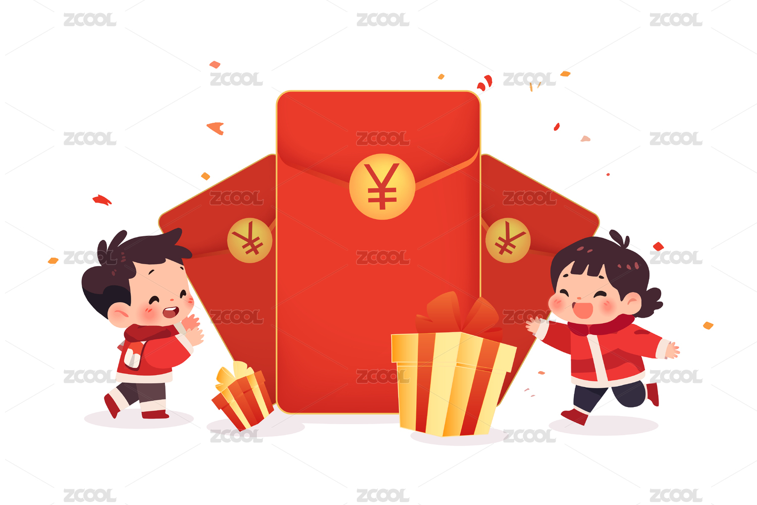 卡通手绘红包人物喜庆推广促销庆祝送红包金币插画