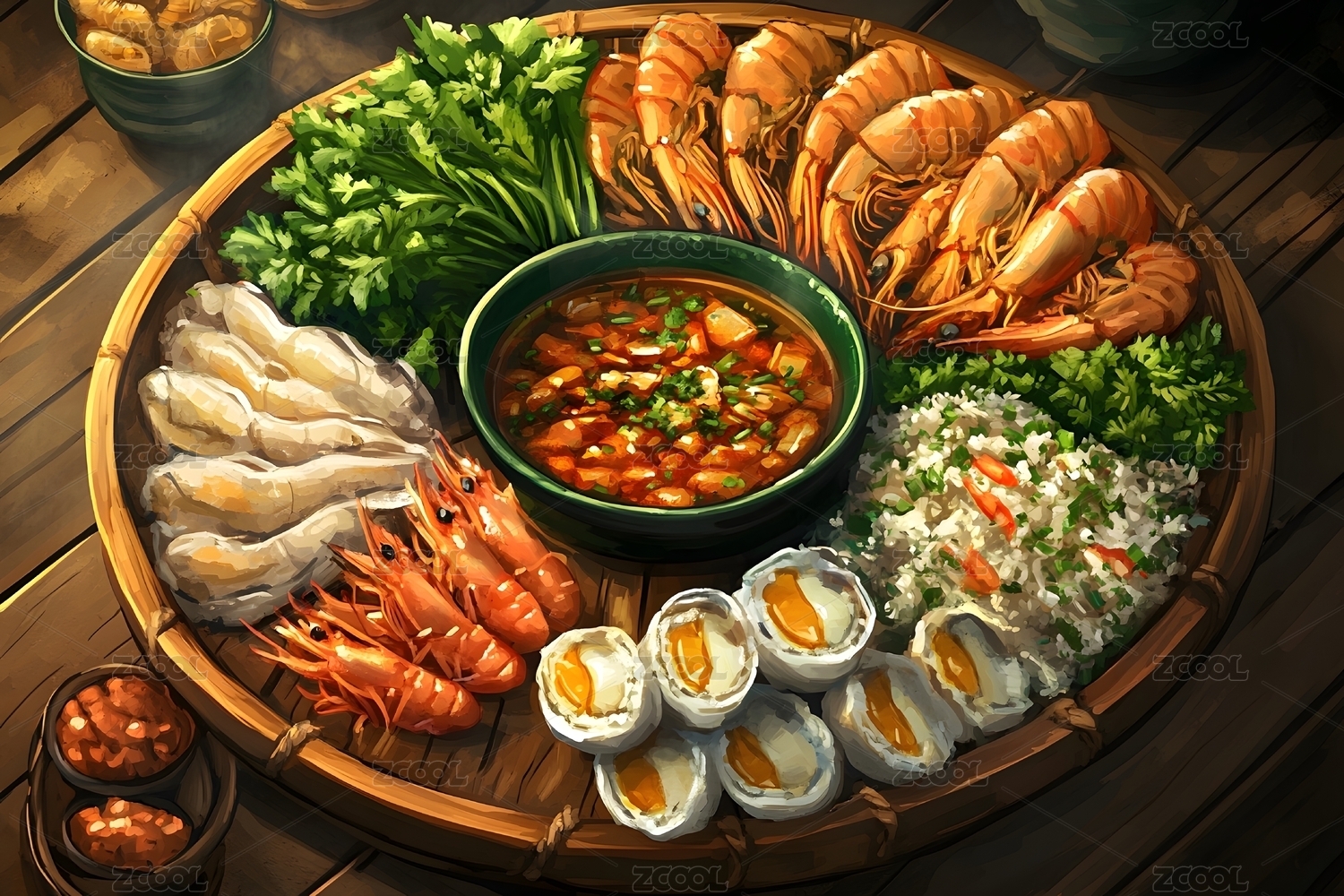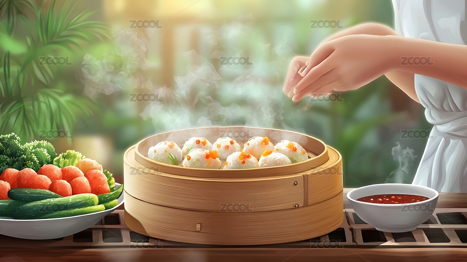 竹蒸笼旁的新鲜蔬菜与蘸酱