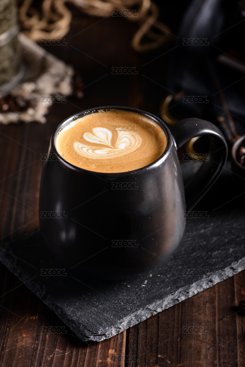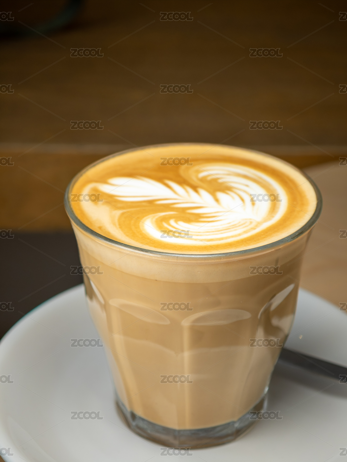 咖啡馆木桌上带有树叶拉花图案的咖啡