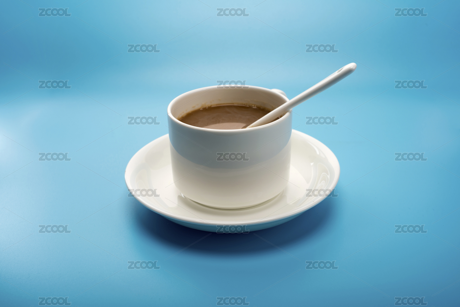 一个放着勺子的白色陶瓷杯里冲泡的咖啡