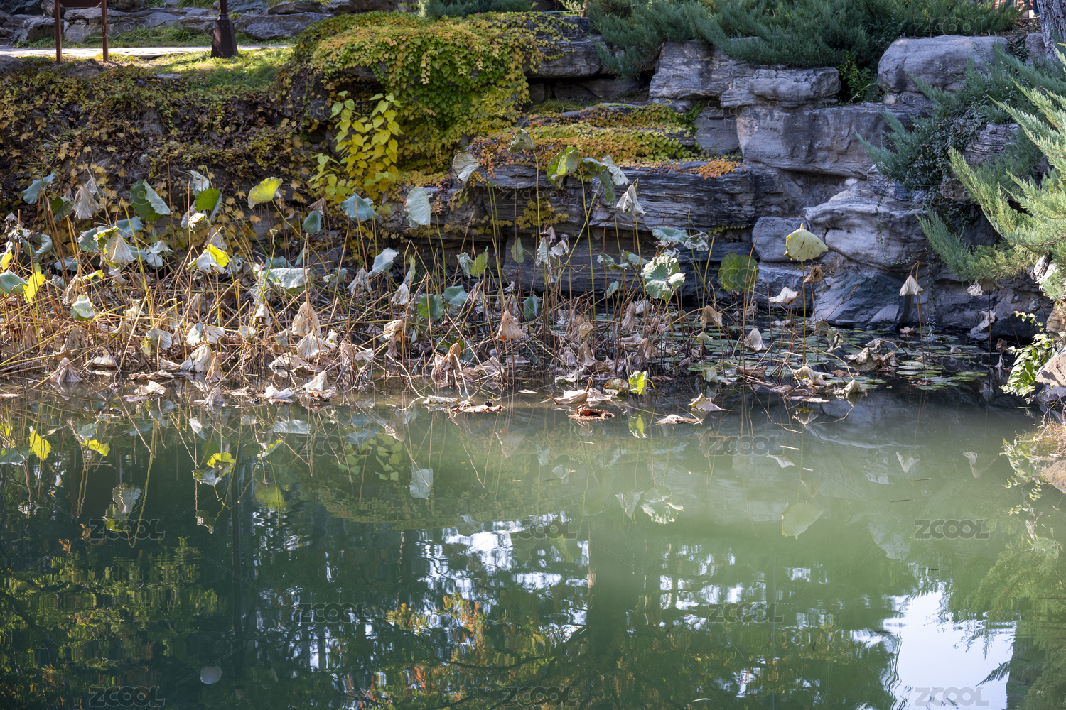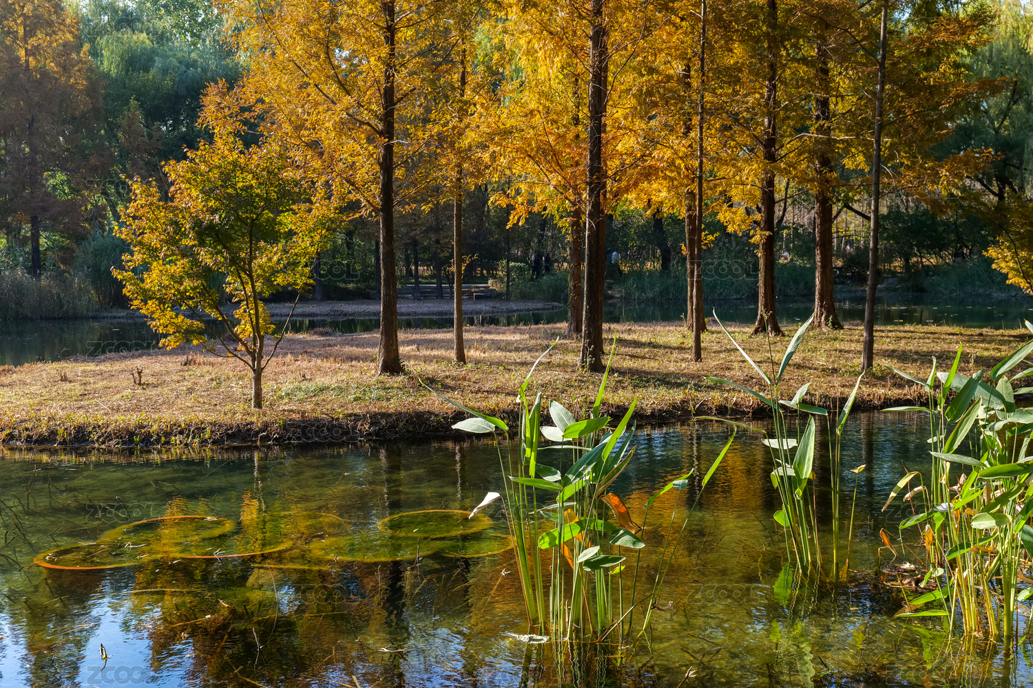 秋季夕阳下的哈尔滨太阳岛的鹿苑园林池塘和
