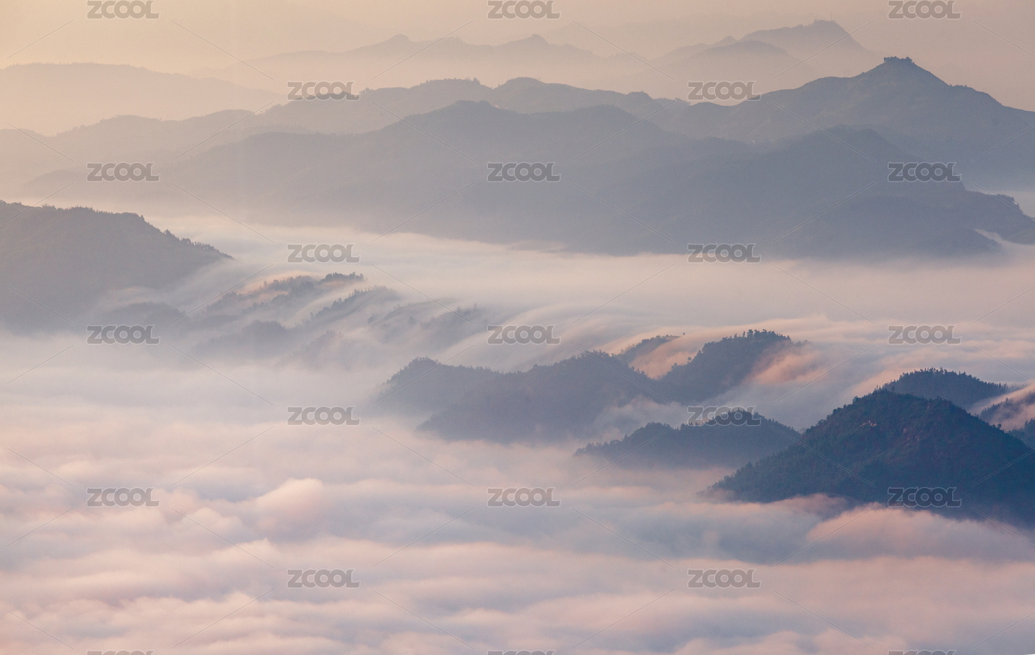 黎明时分群山间云雾缭绕,中国江西婺源江岭