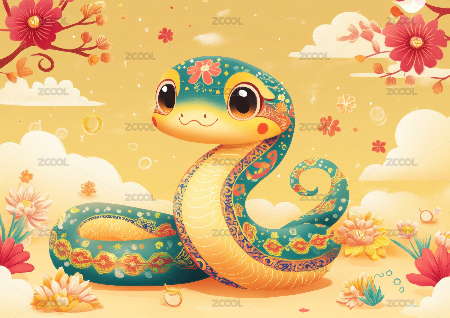 卡通可爱风蛇生肖元素海报装饰