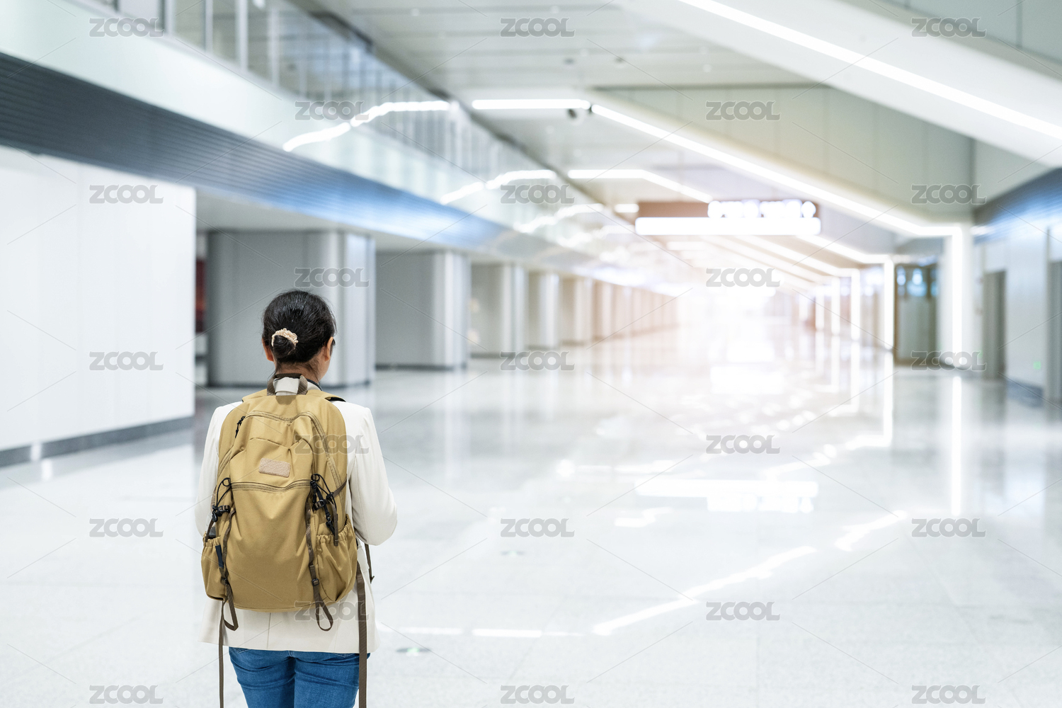 地铁站走廊行走的背包通勤客