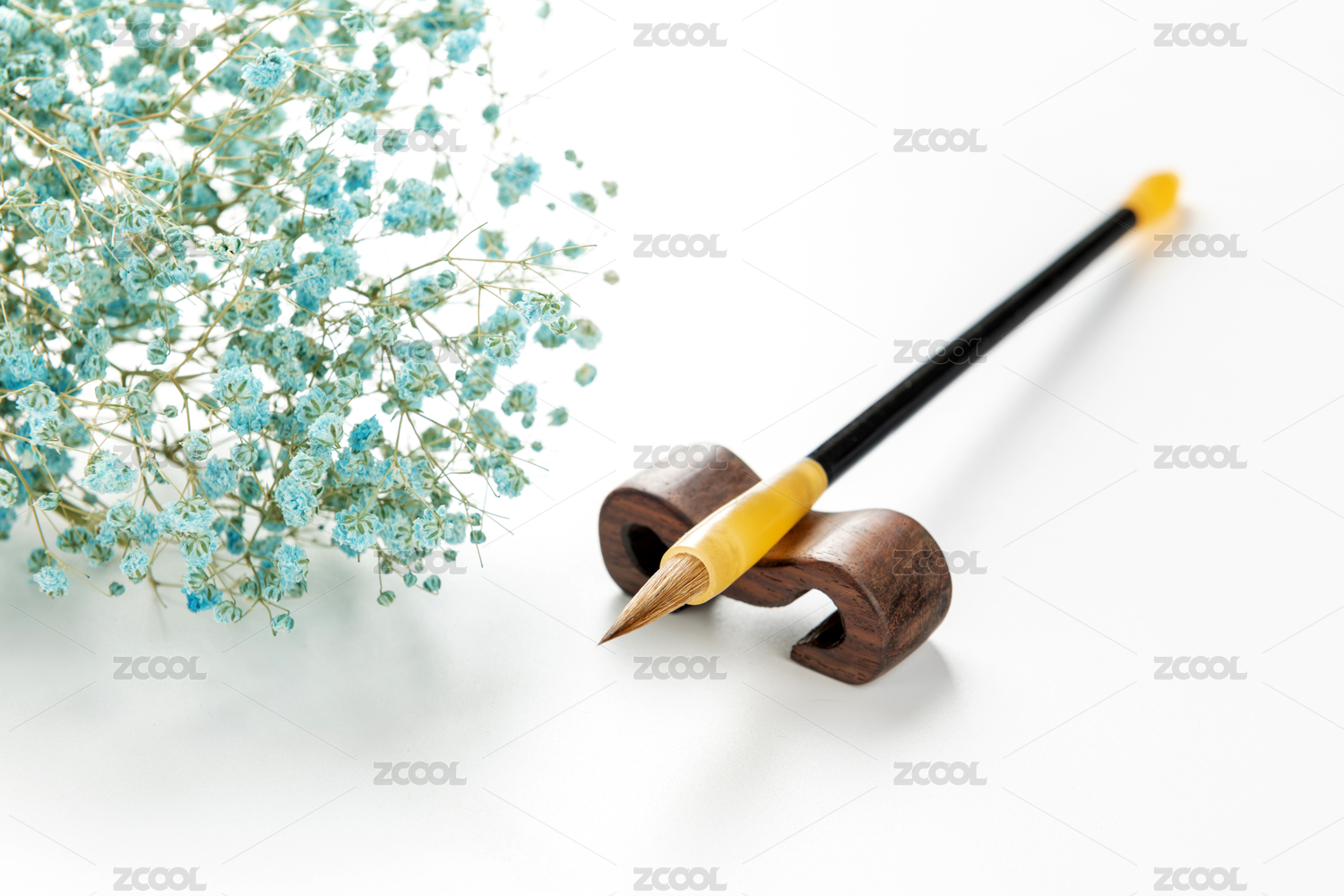 一支架在笔架上的毛笔特写白色背景