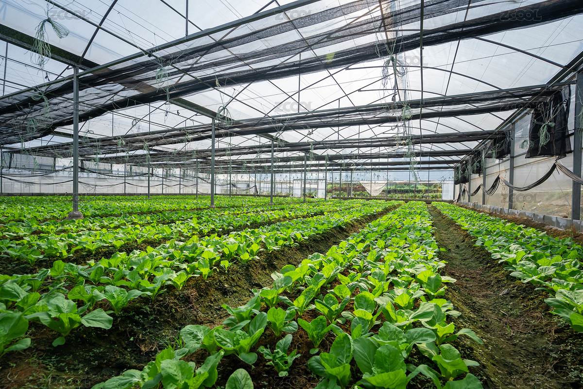 种植白菜的钢架大棚内部全景,中国福建龙岩