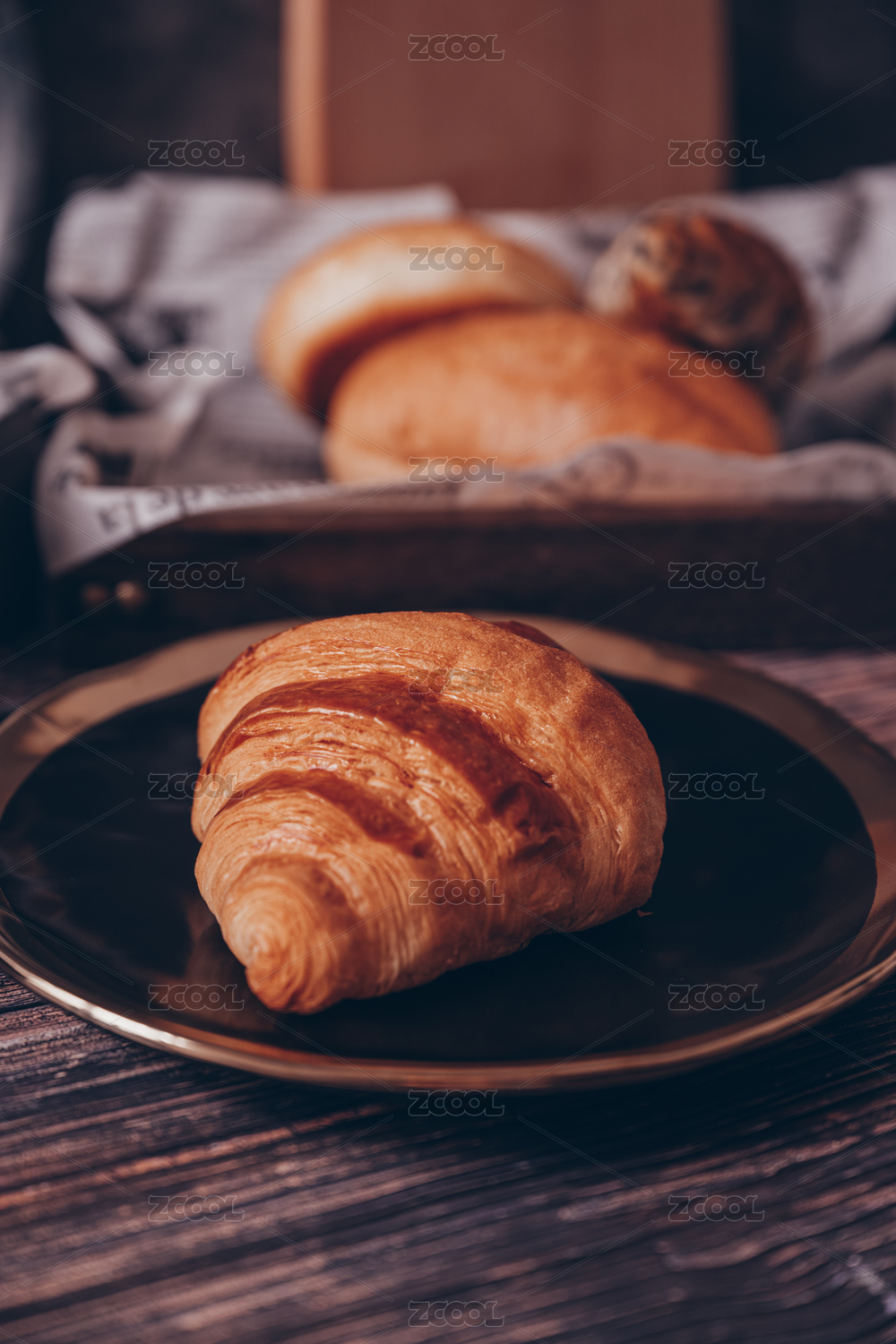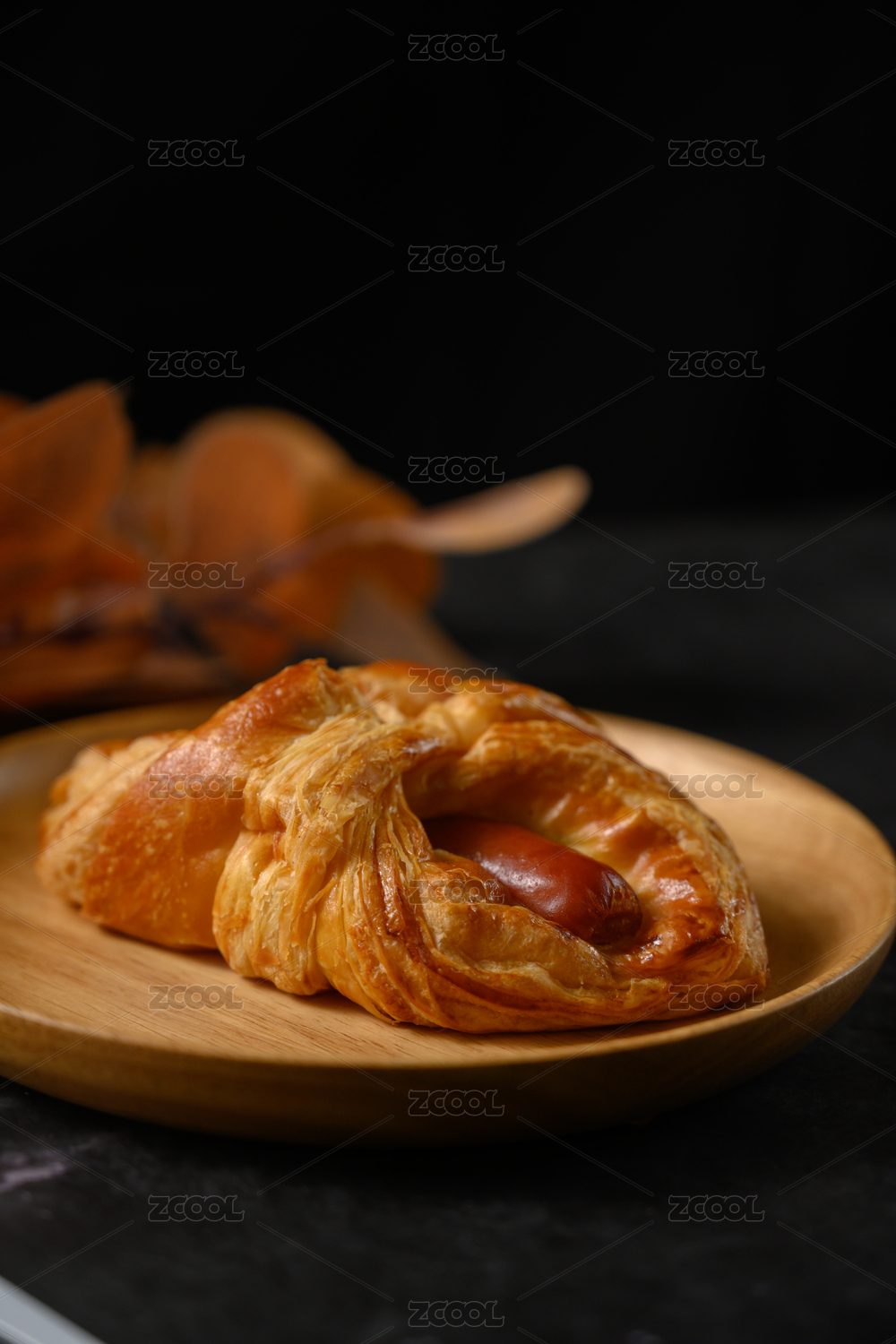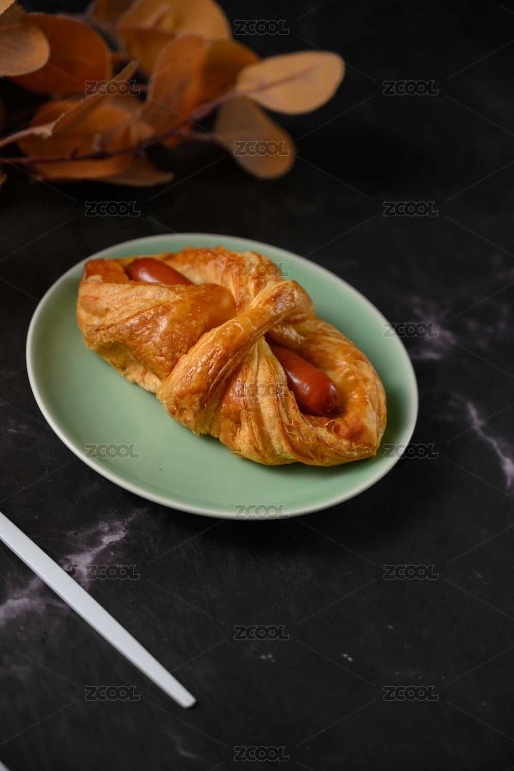 桌面上的盘子里的美味可口的丹麦肠仔包