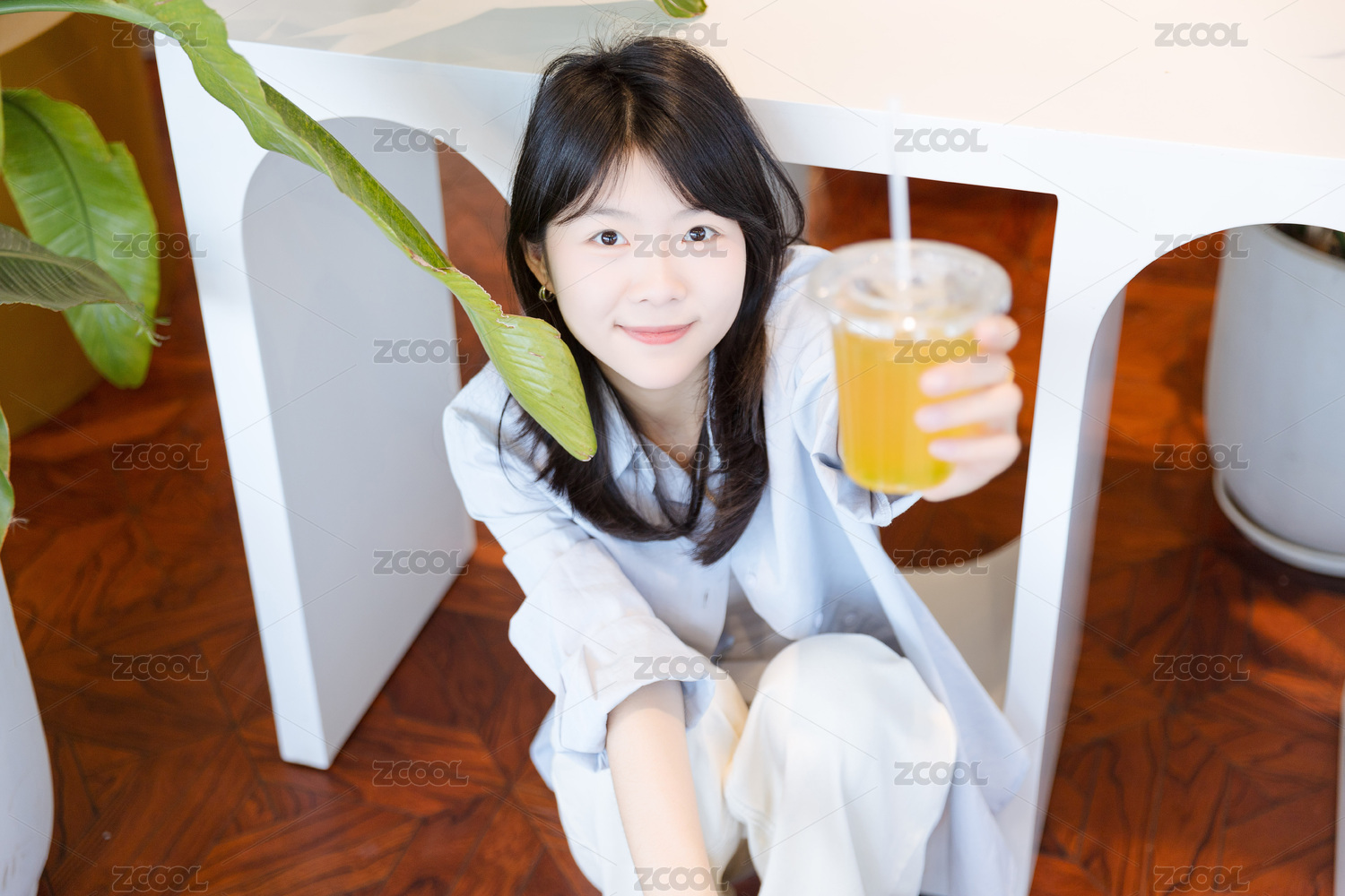 在烘焙店吃面包喝牛奶的可爱亚洲少女