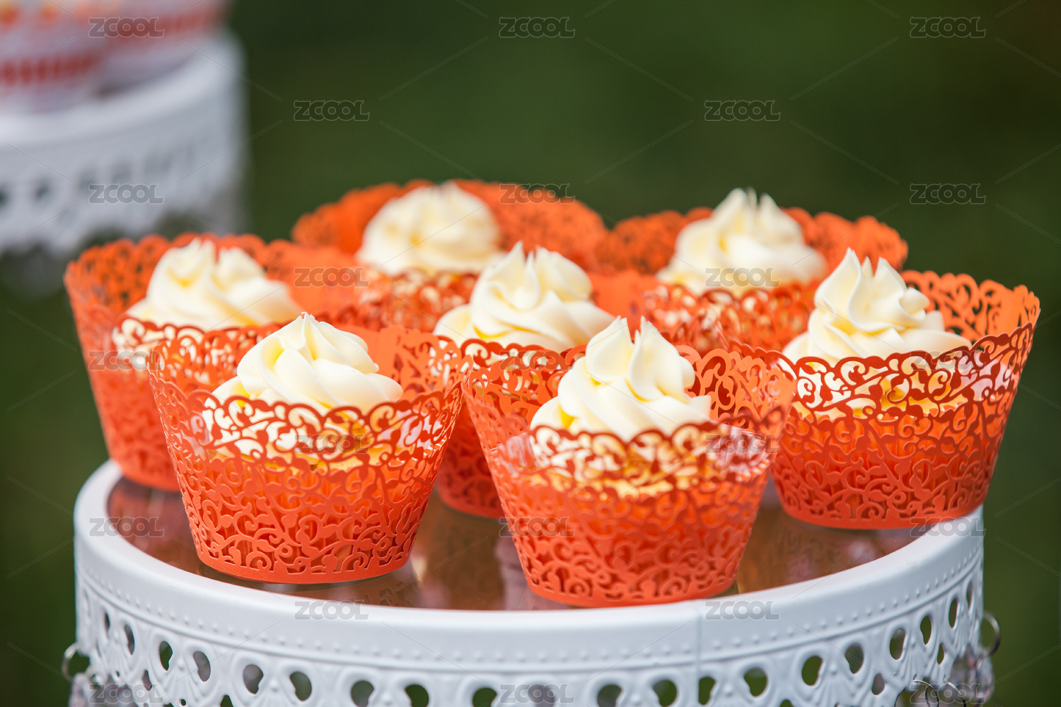 托盘里摆放的杯子奶油蛋糕,可爱甜品。