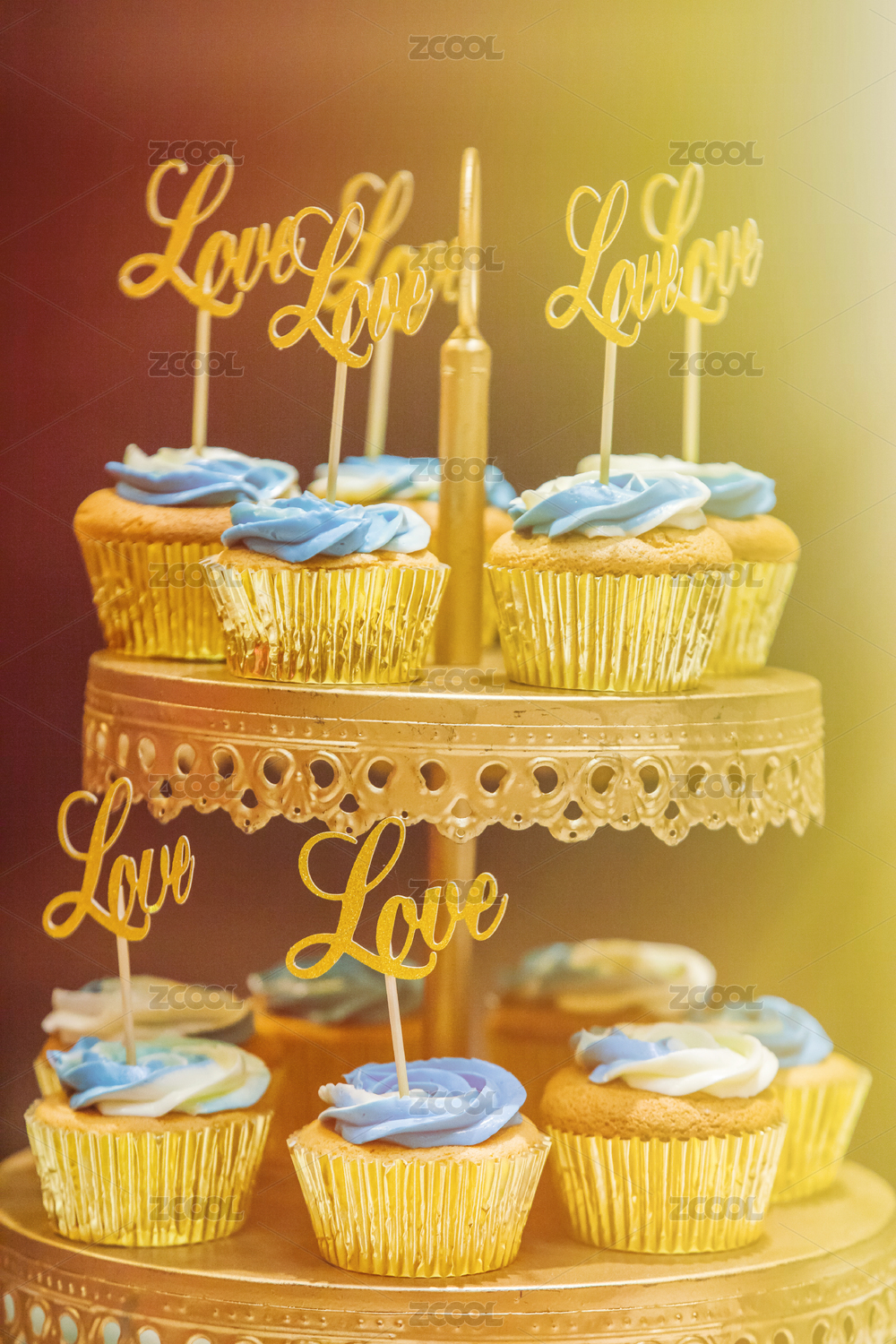 金色托盘里摆放着蓝色系杯子蛋糕。