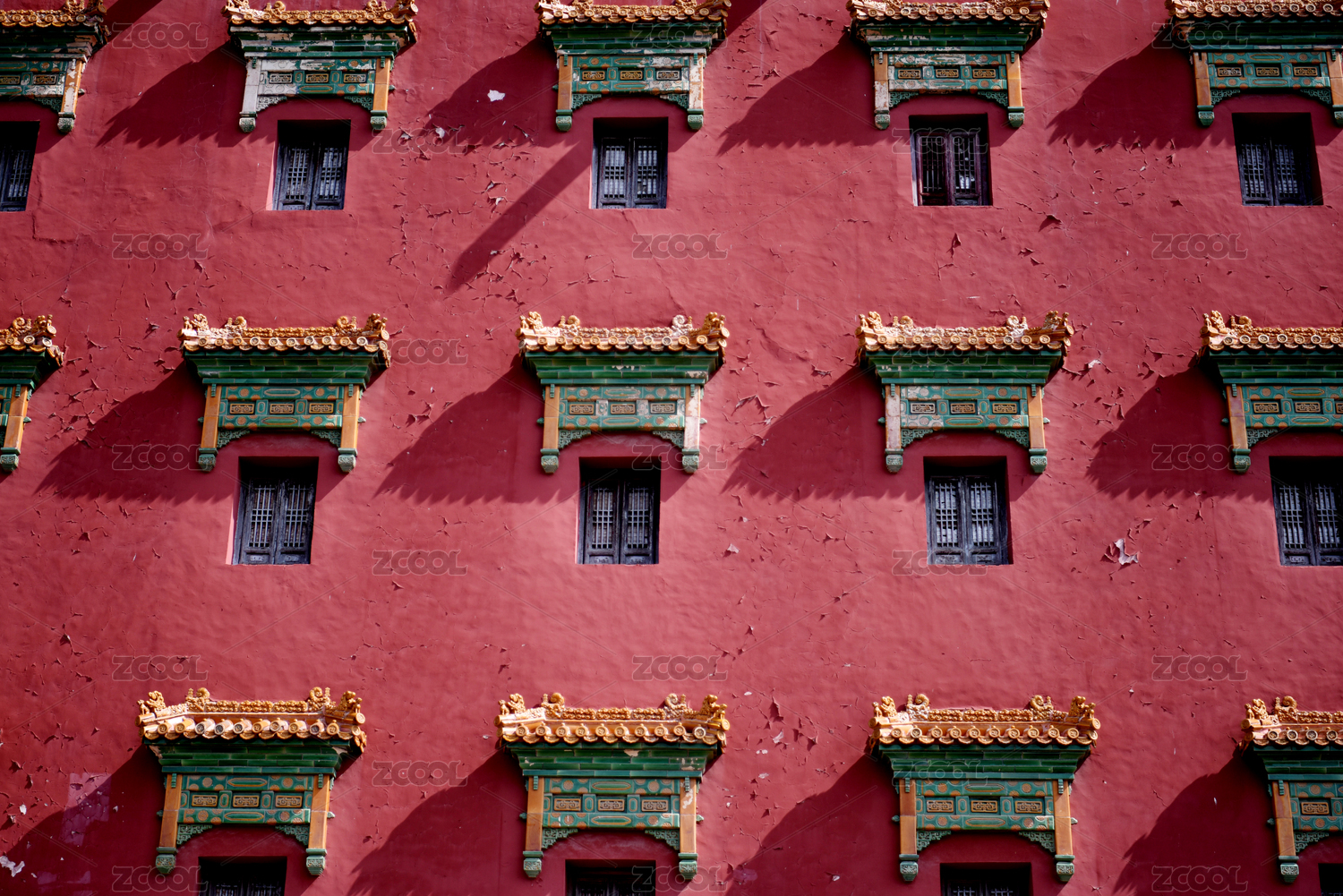 中国北京故宫紫禁城内的门与阴影下的红色浮雕影背墙