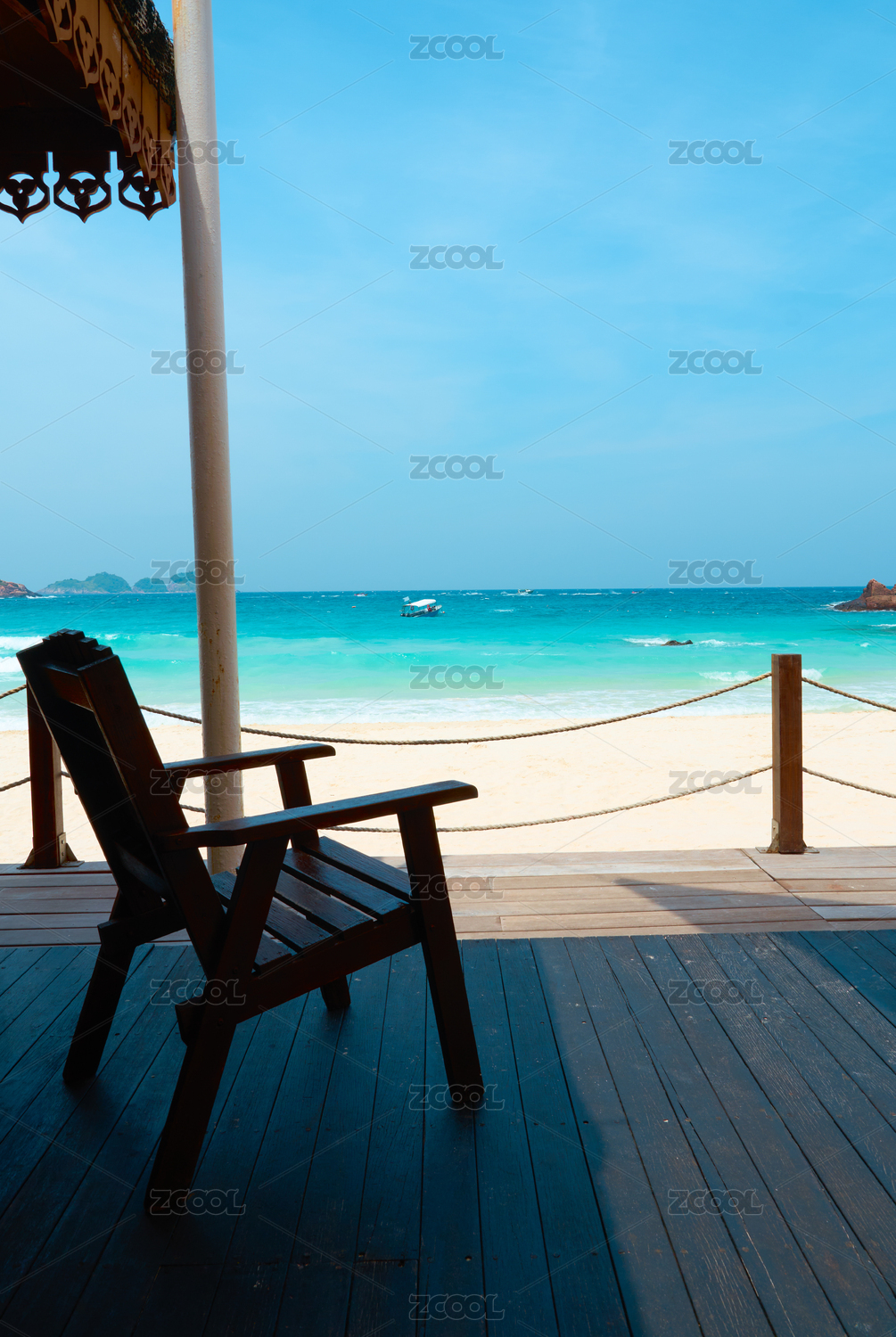 空荡荡的木质餐厅桌子面朝美丽的热带海洋
