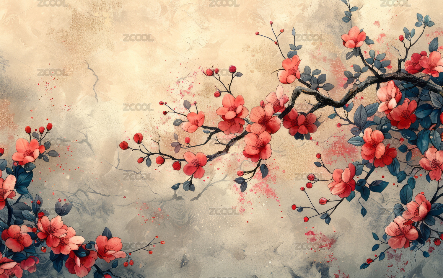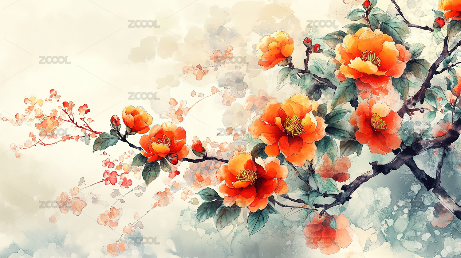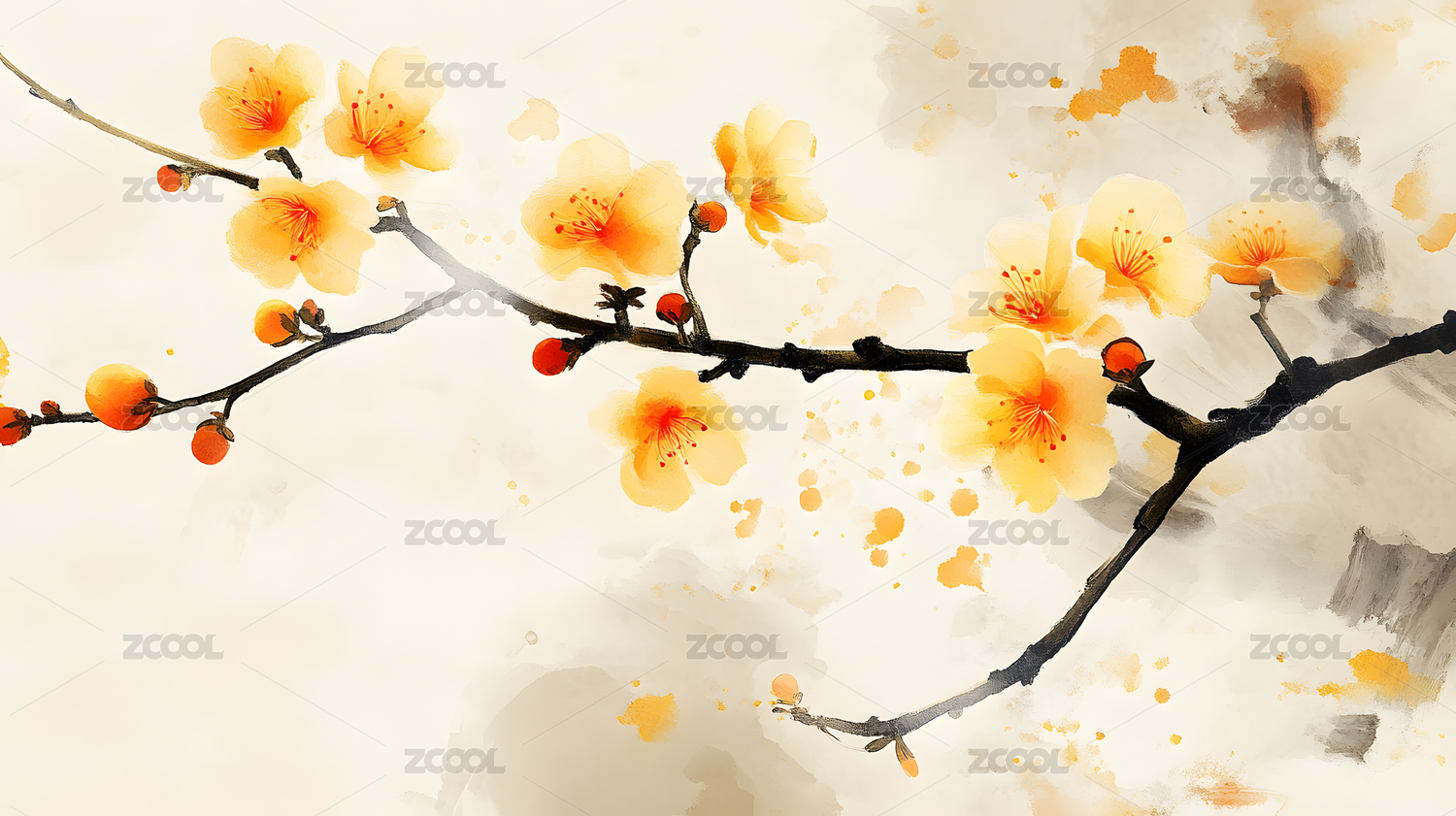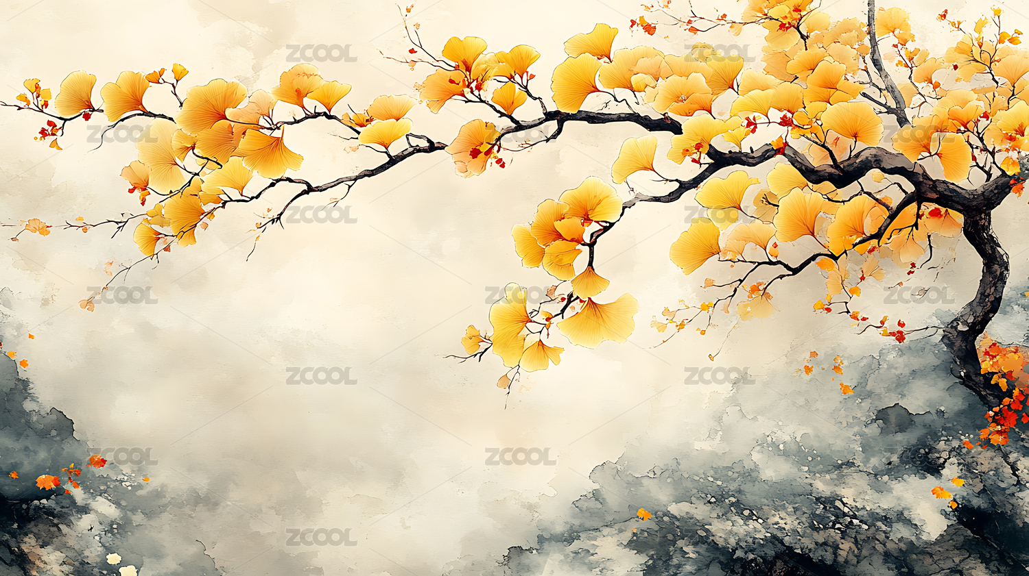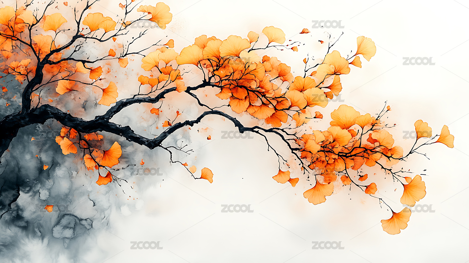 中国风,菊花,水彩风,浅色背景,晕染,清雅,树干,水墨元素,银杏