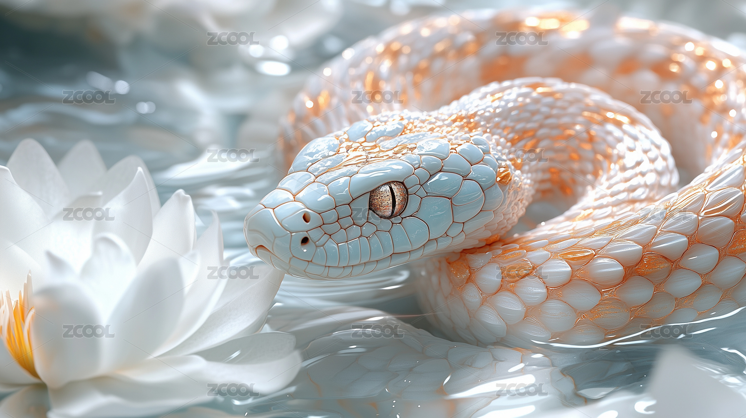 蛇,白蛇,白色,莲花,水面,自然,细节,优雅,静谧,动物