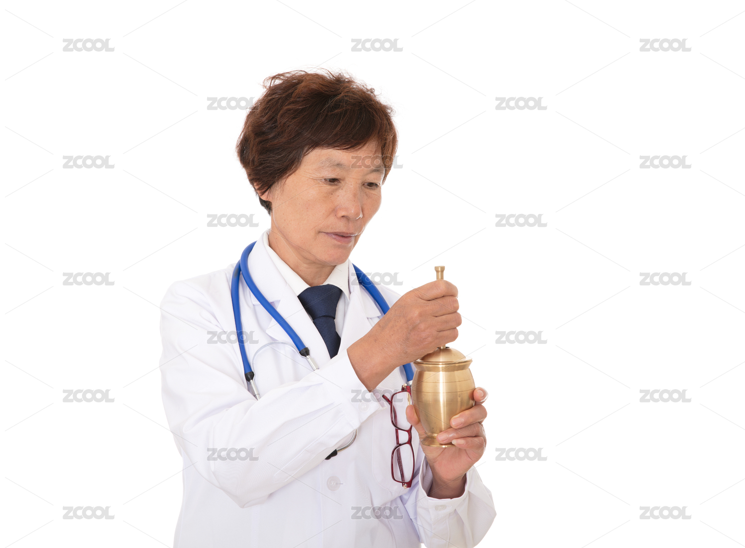白背景前的中医大夫查看药臼里药材的情况