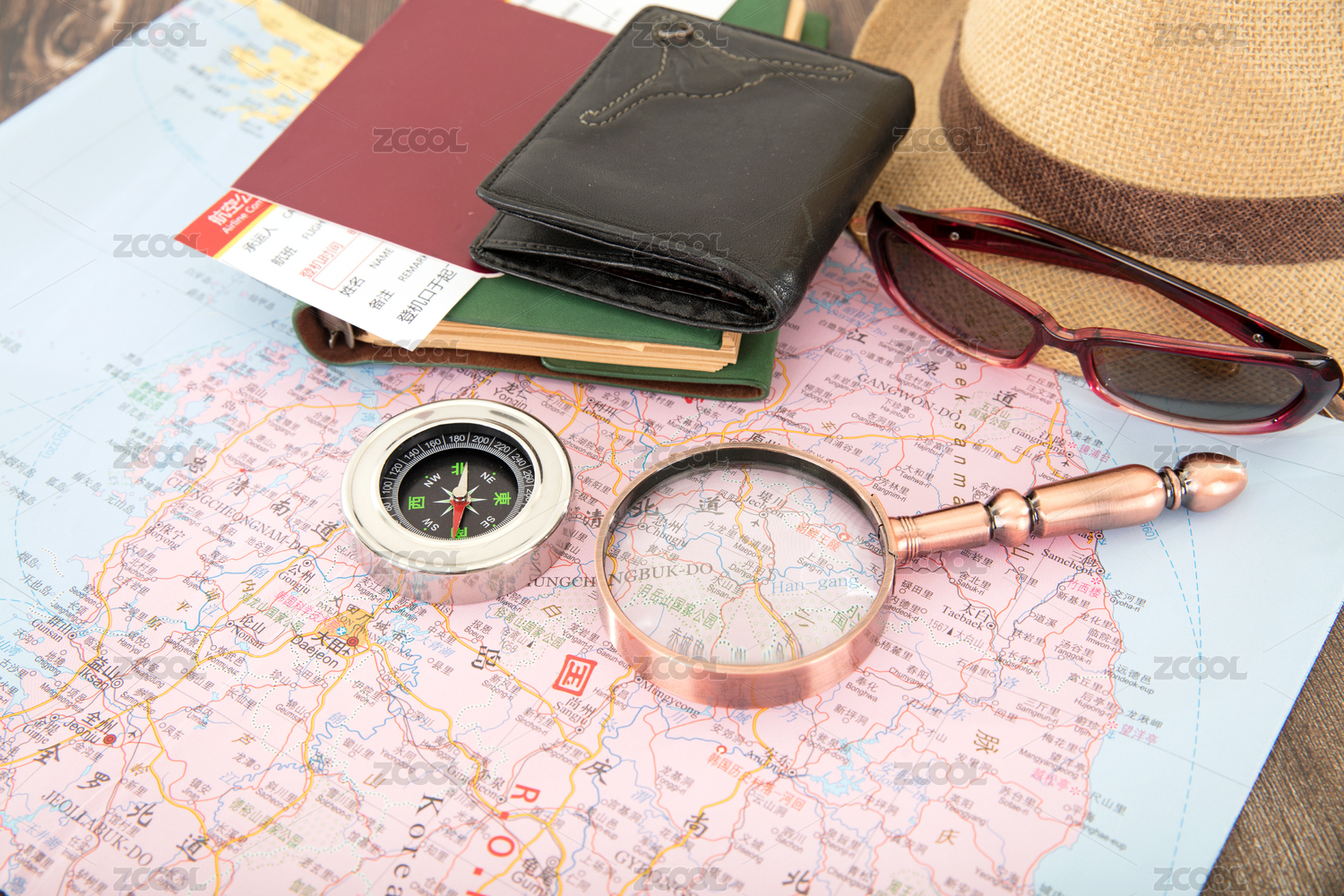 韩国地图背景上的各种工具物品寓意韩国旅游线路计划