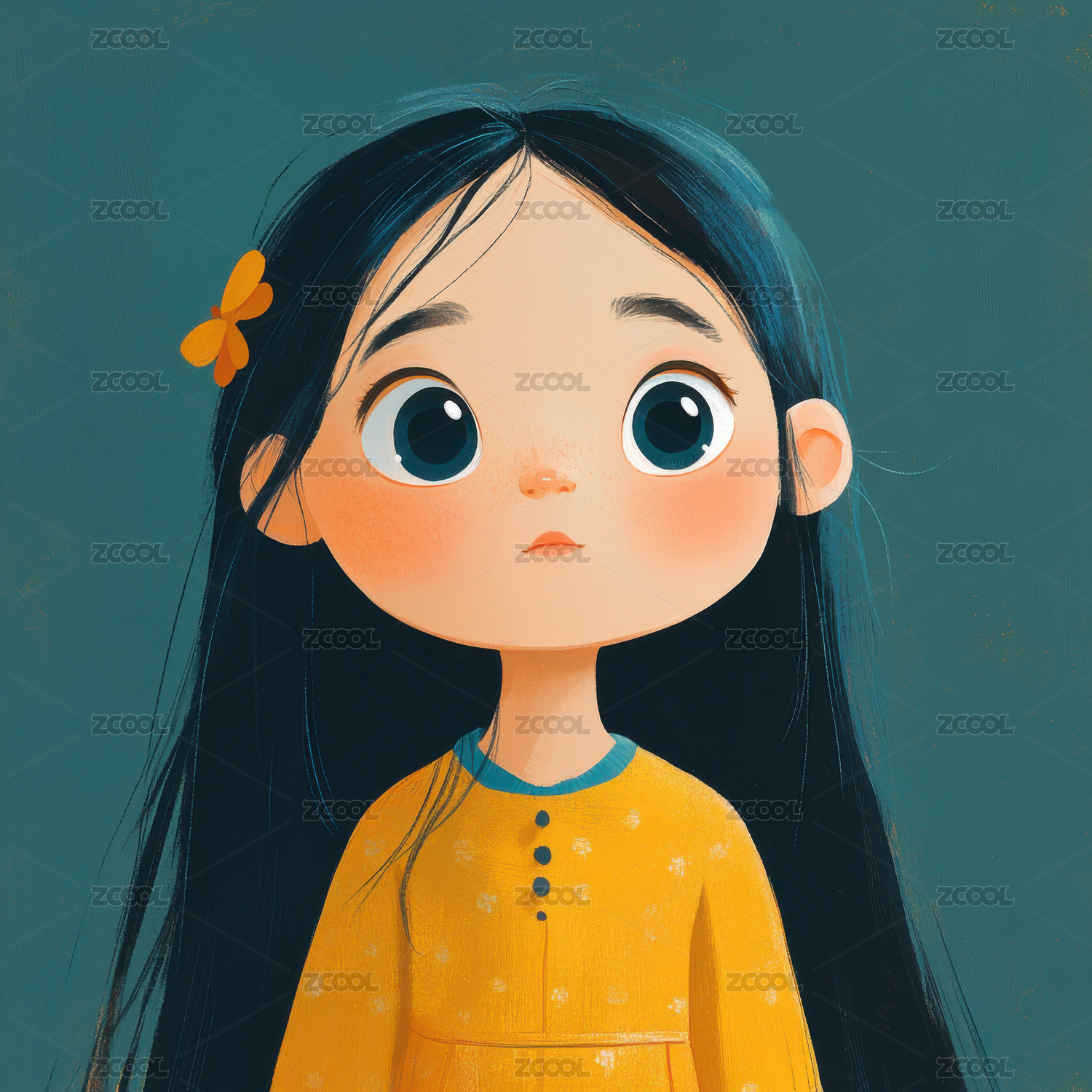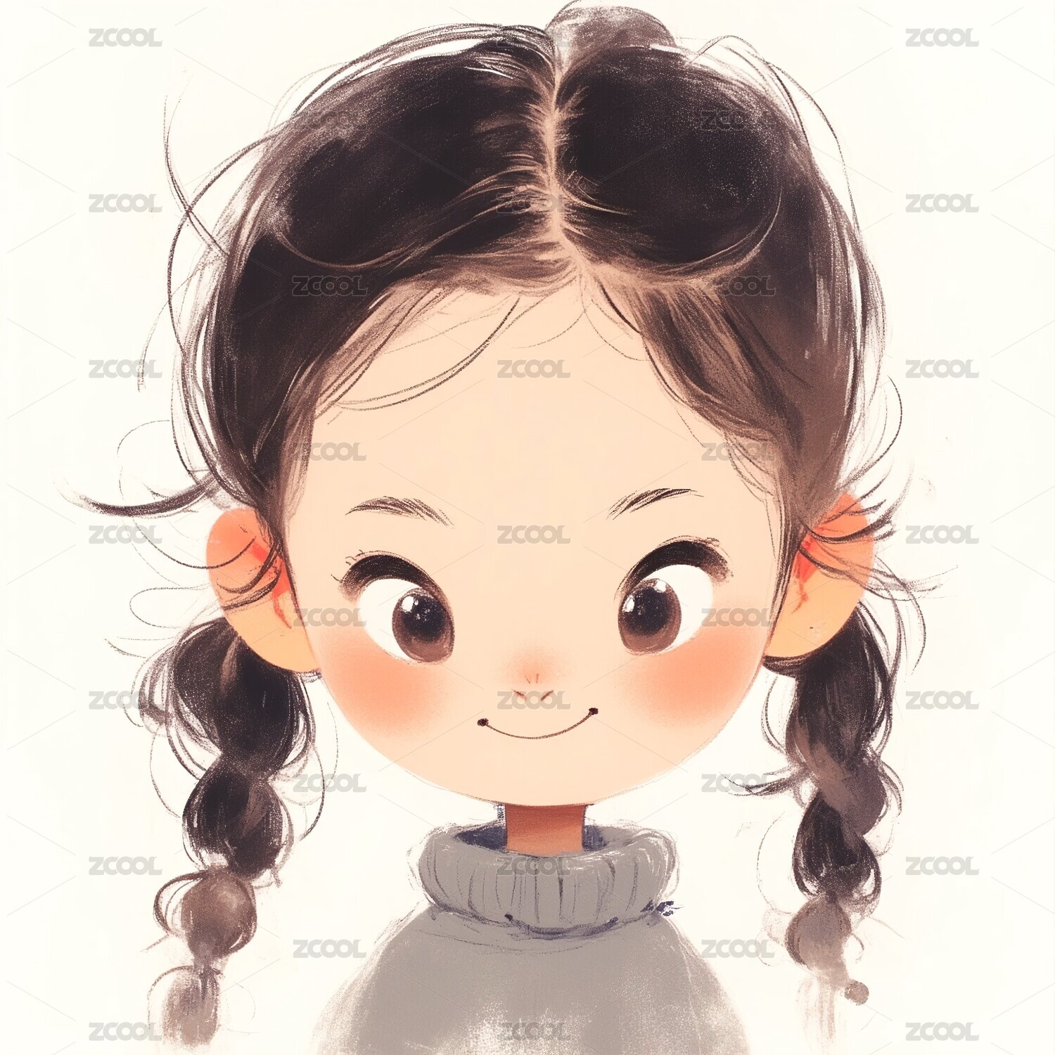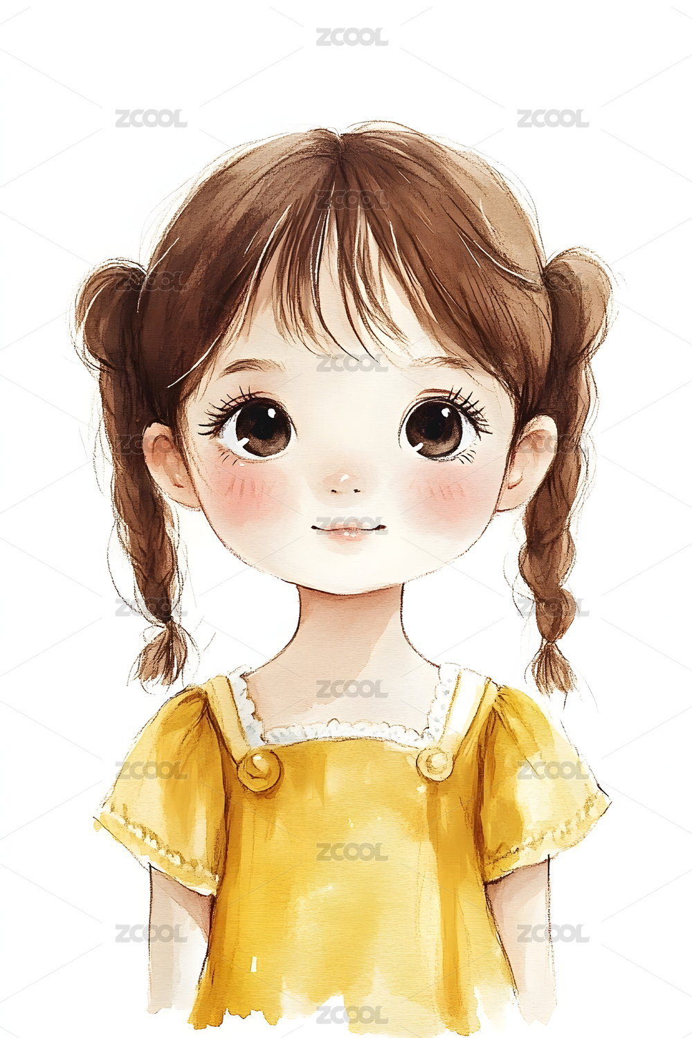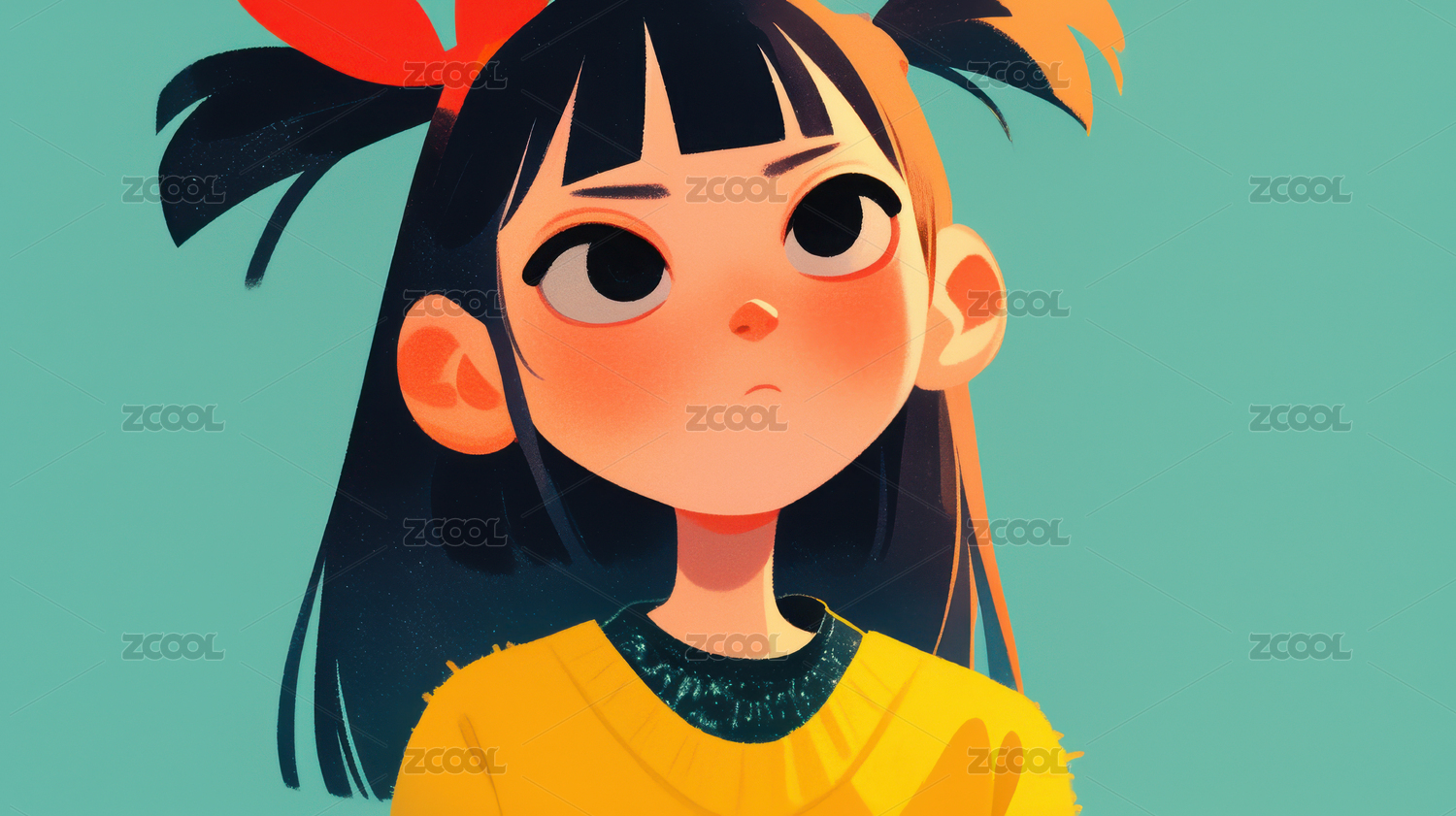 马尾辫和裙子的卡通女孩站着思考高清图片