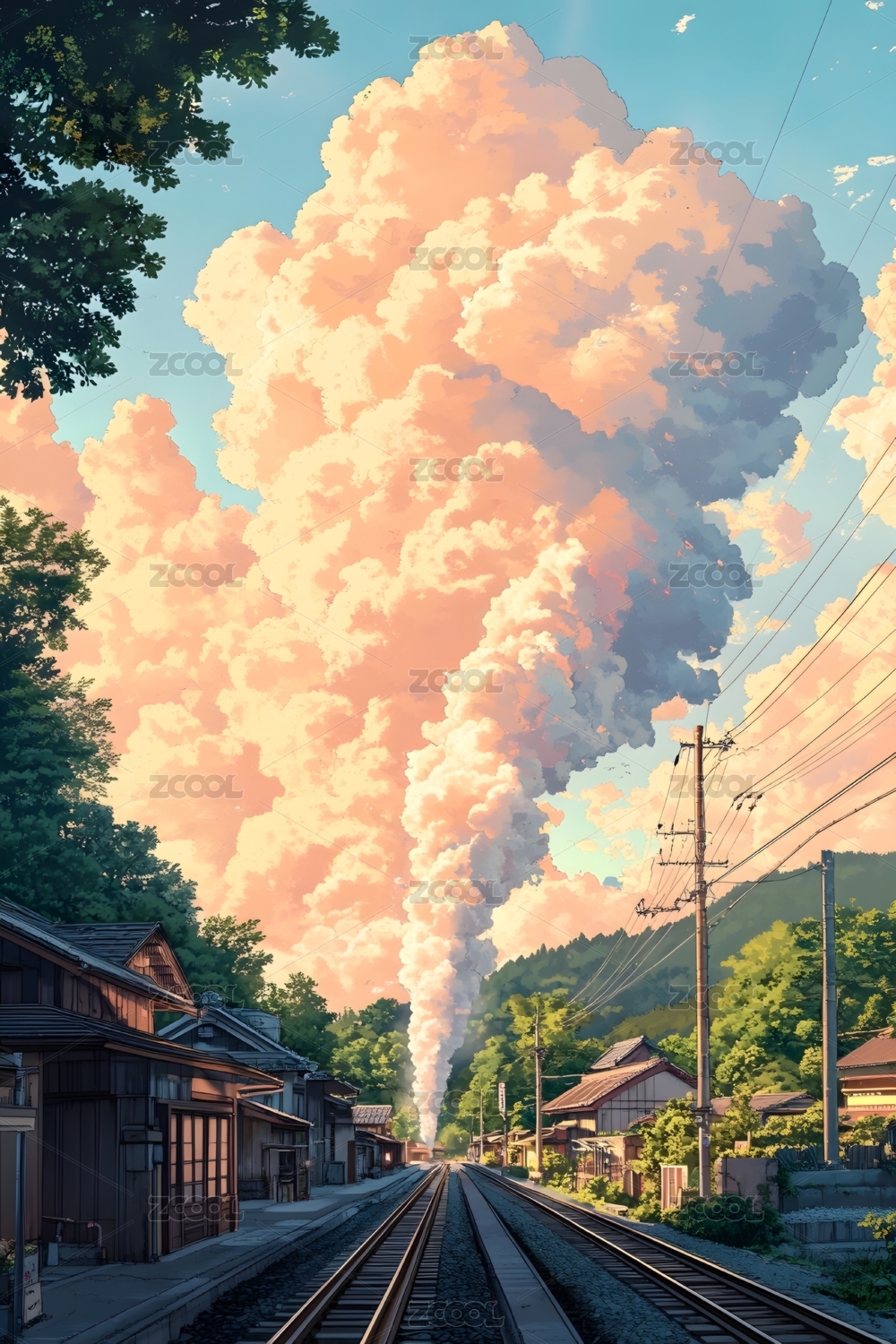 冬季,雪景,火车轨道,房屋,树木,山脉,风景,自然,绘画,插画