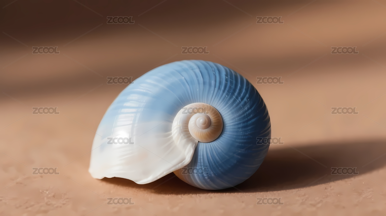 蓝色背景中在倾听螺壳声音的男士微缩创意