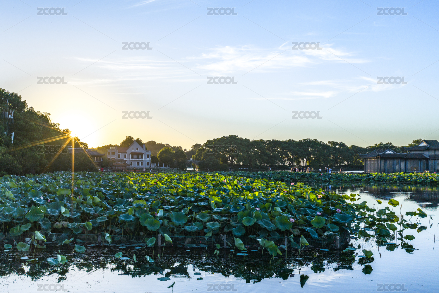 南宁狮山公园湖泊水塘荷叶与夕阳晚霞云彩