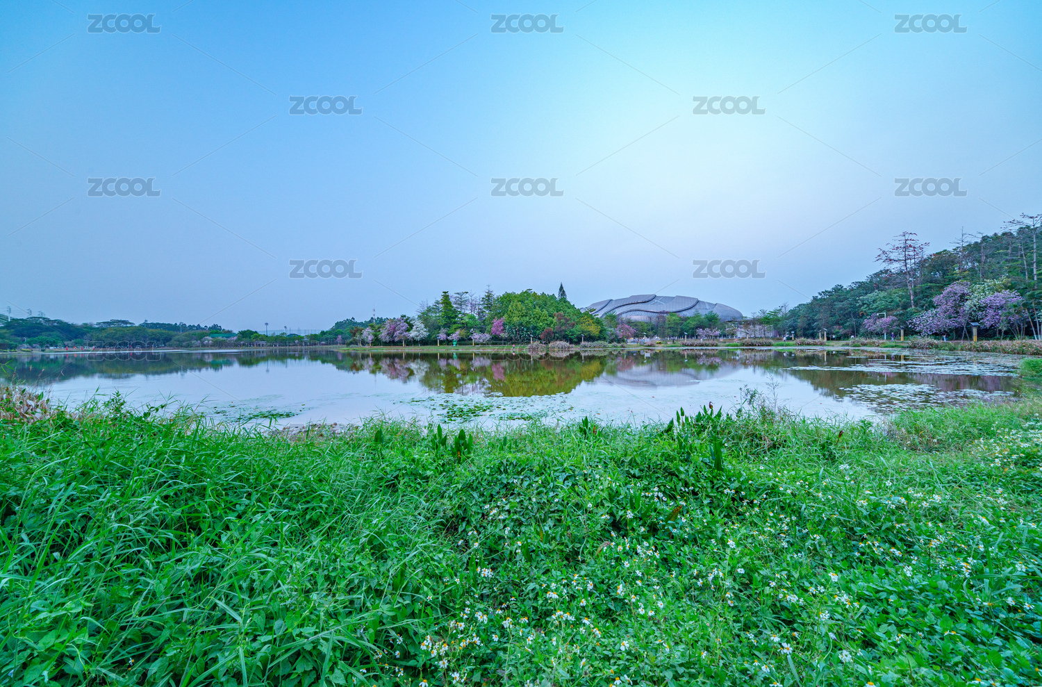 广州番禺大学城中心湖公园湖泊树林