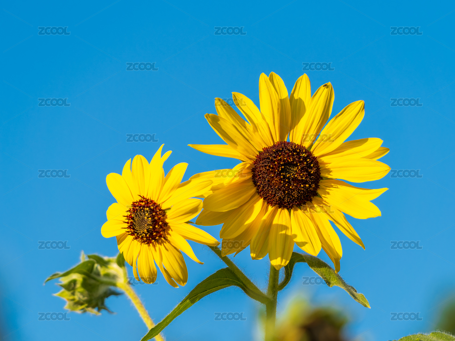 蓝天下的花园里盛开的向日葵花朵植物特写