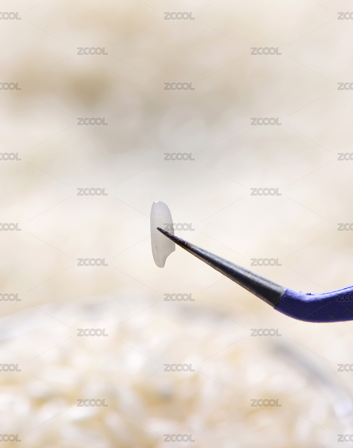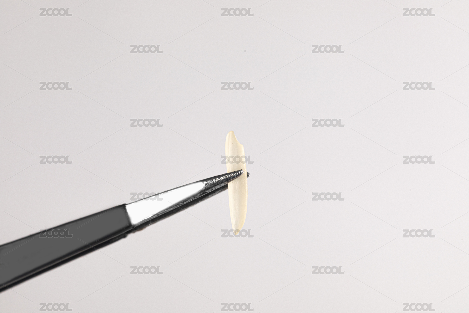 黑色背景前的一粒长粒猫牙米用镊子夹着特写