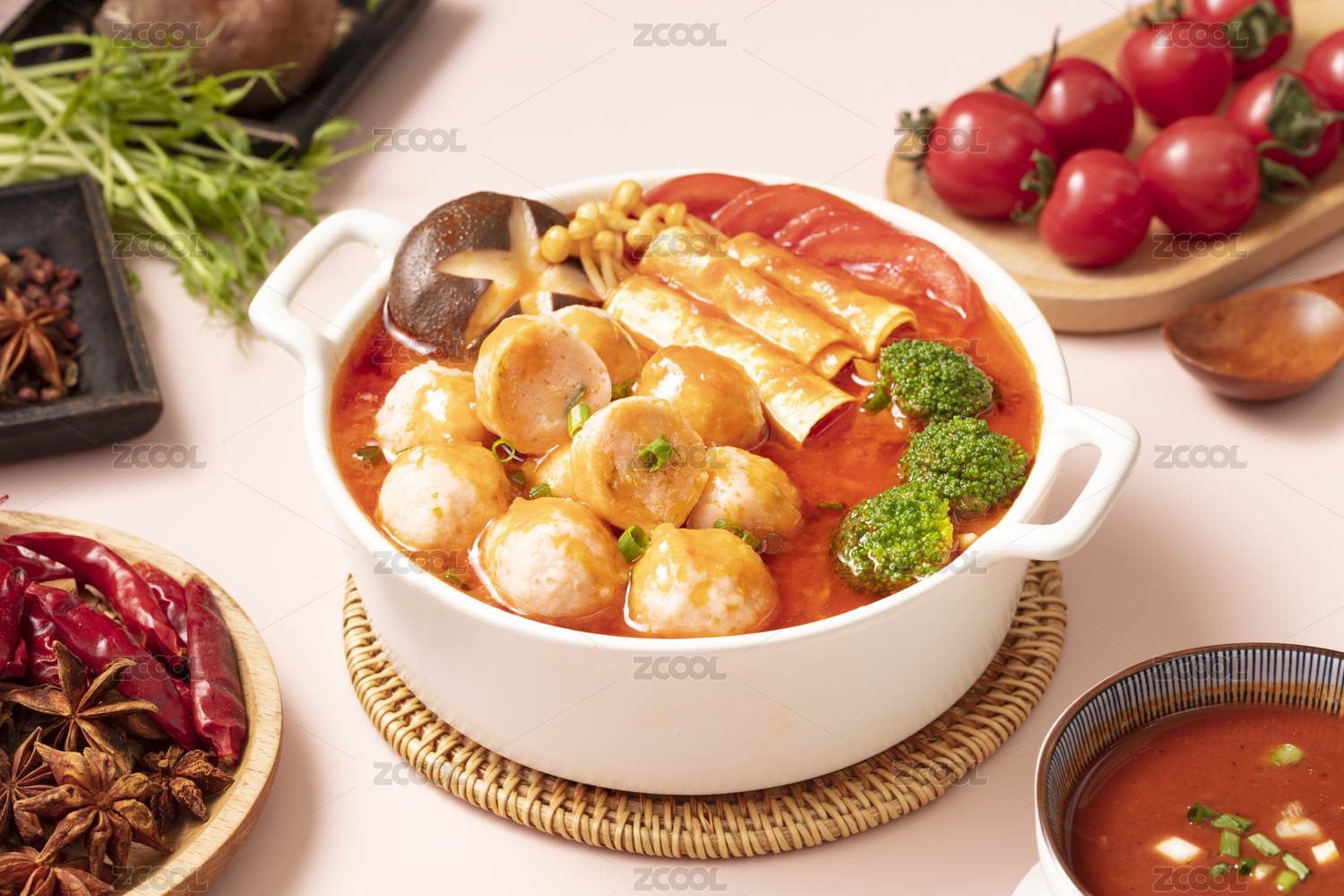 双耳锅里面的麻辣烫番茄丸子小火锅