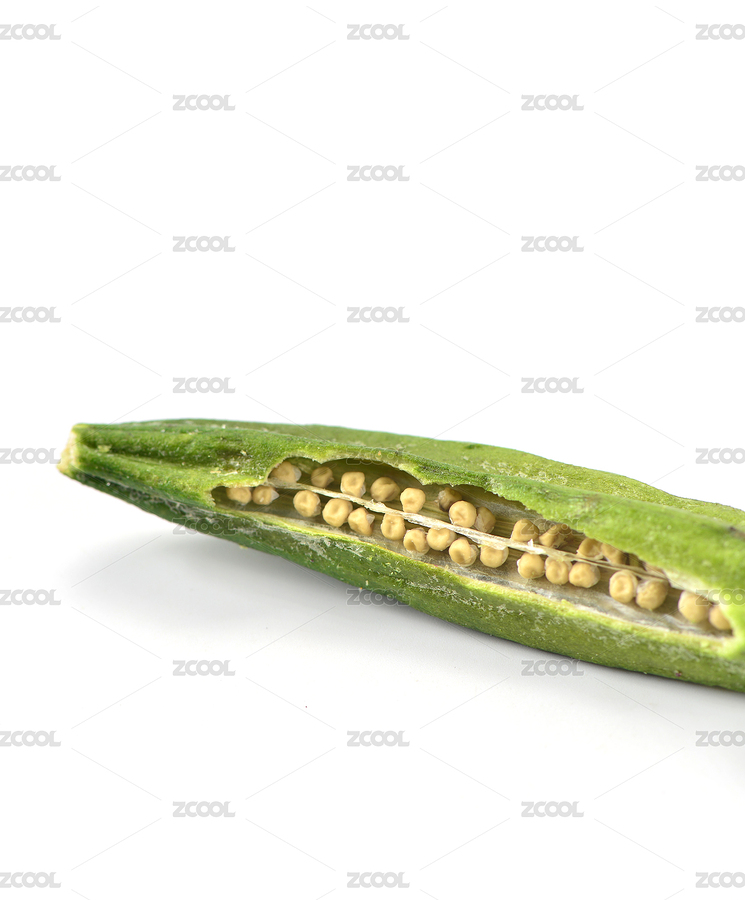 新鲜的秋葵在白色的背景上,特写镜头,以及切开的内部,暴露在外面