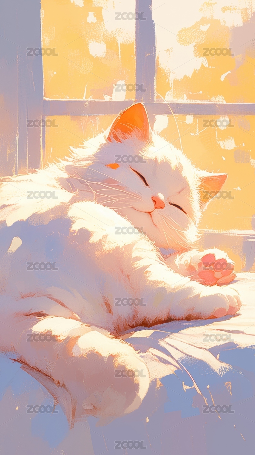 可爱蜡笔彩铅手绘肌理感小白猫手机插画壁纸