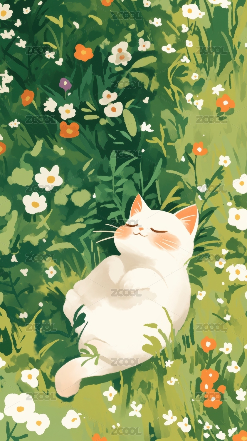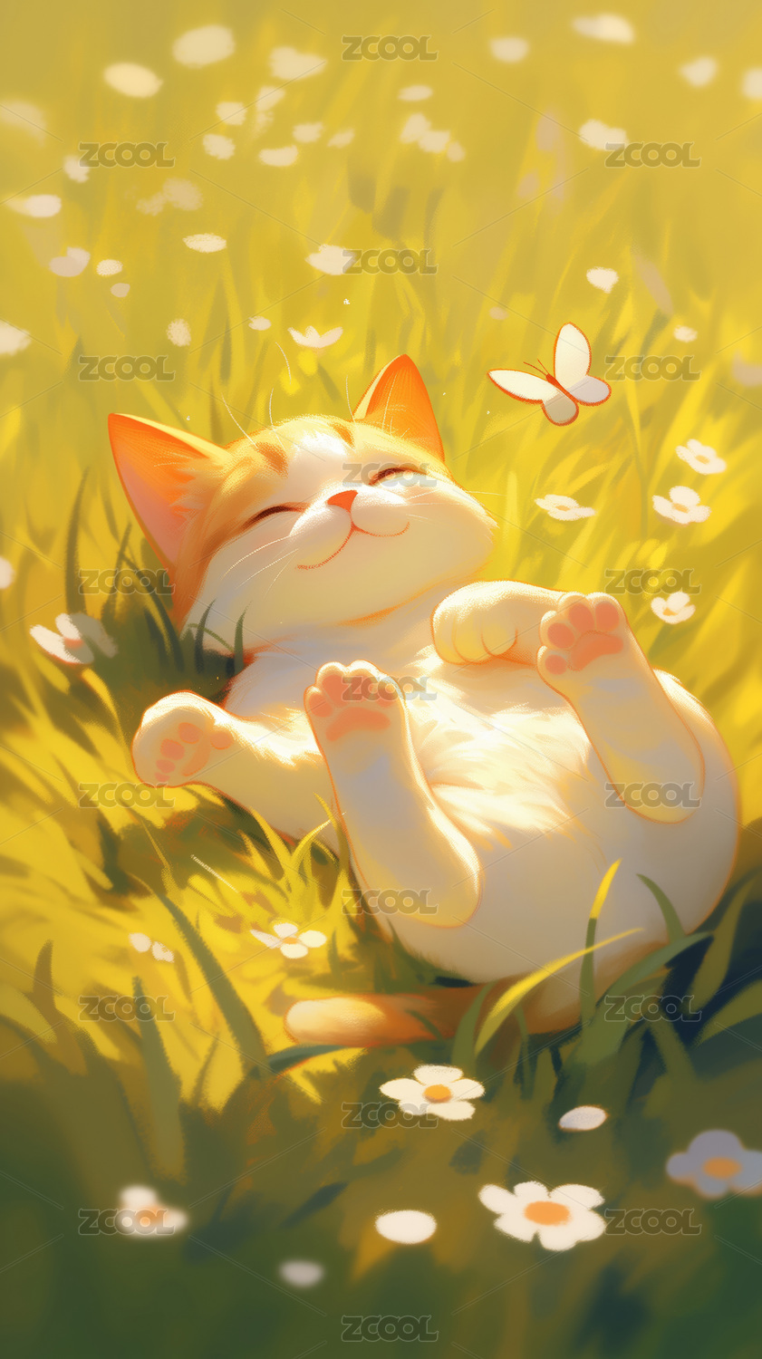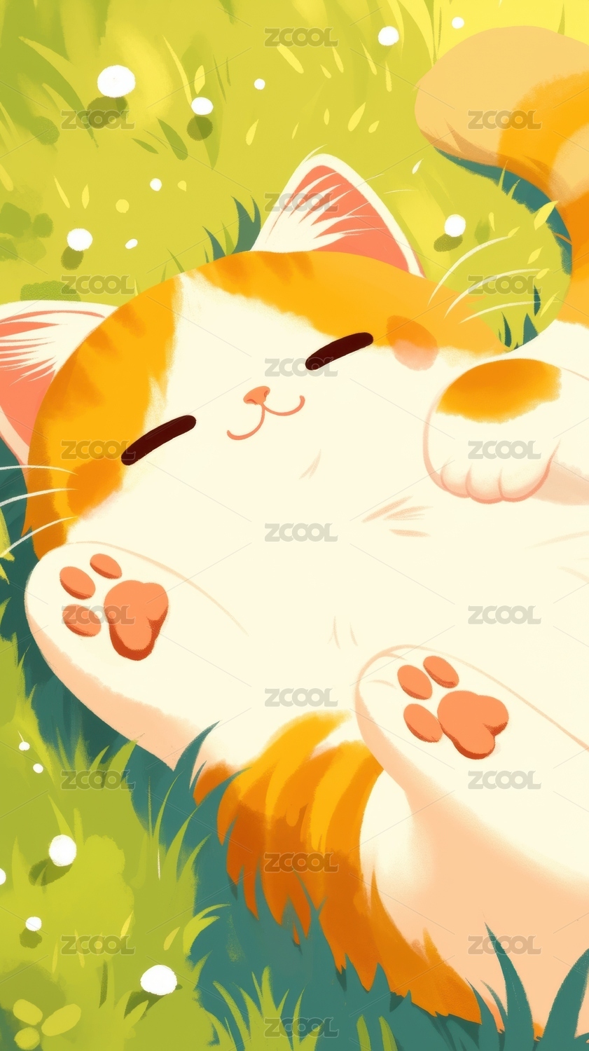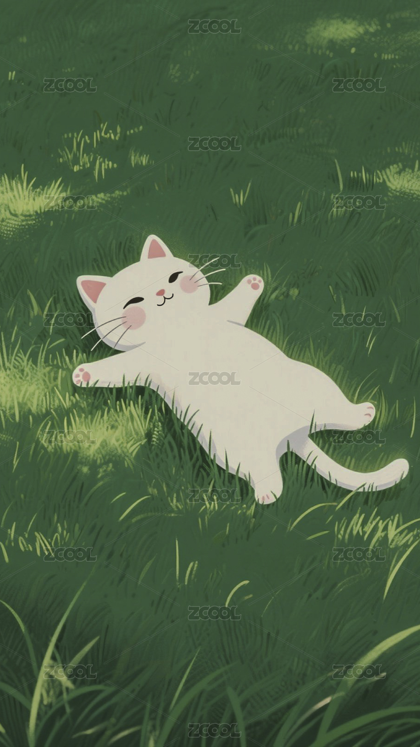 草地午睡的卡通猫