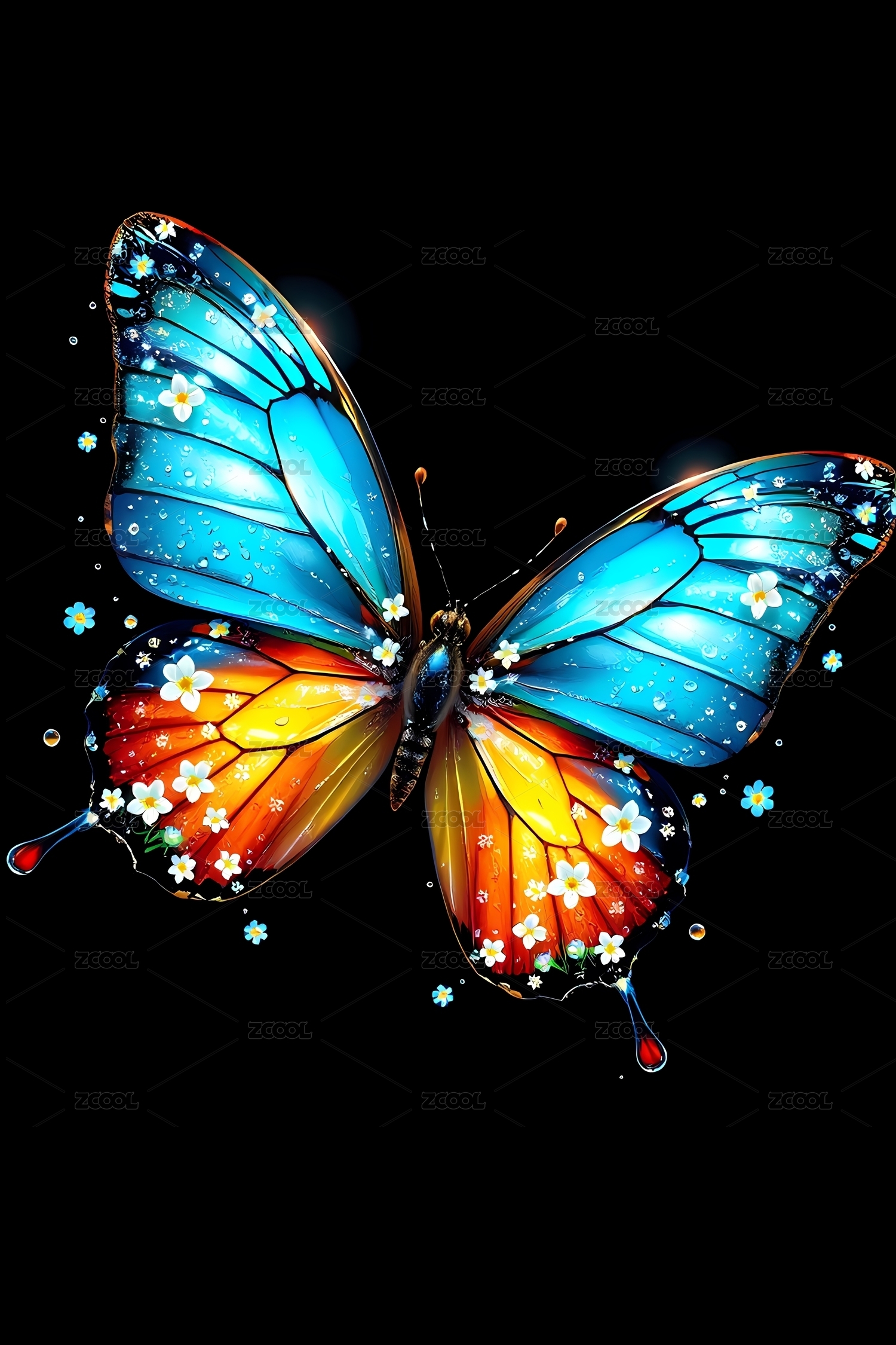 梦幻蓝黄相间蝴蝶于黑背景飞舞